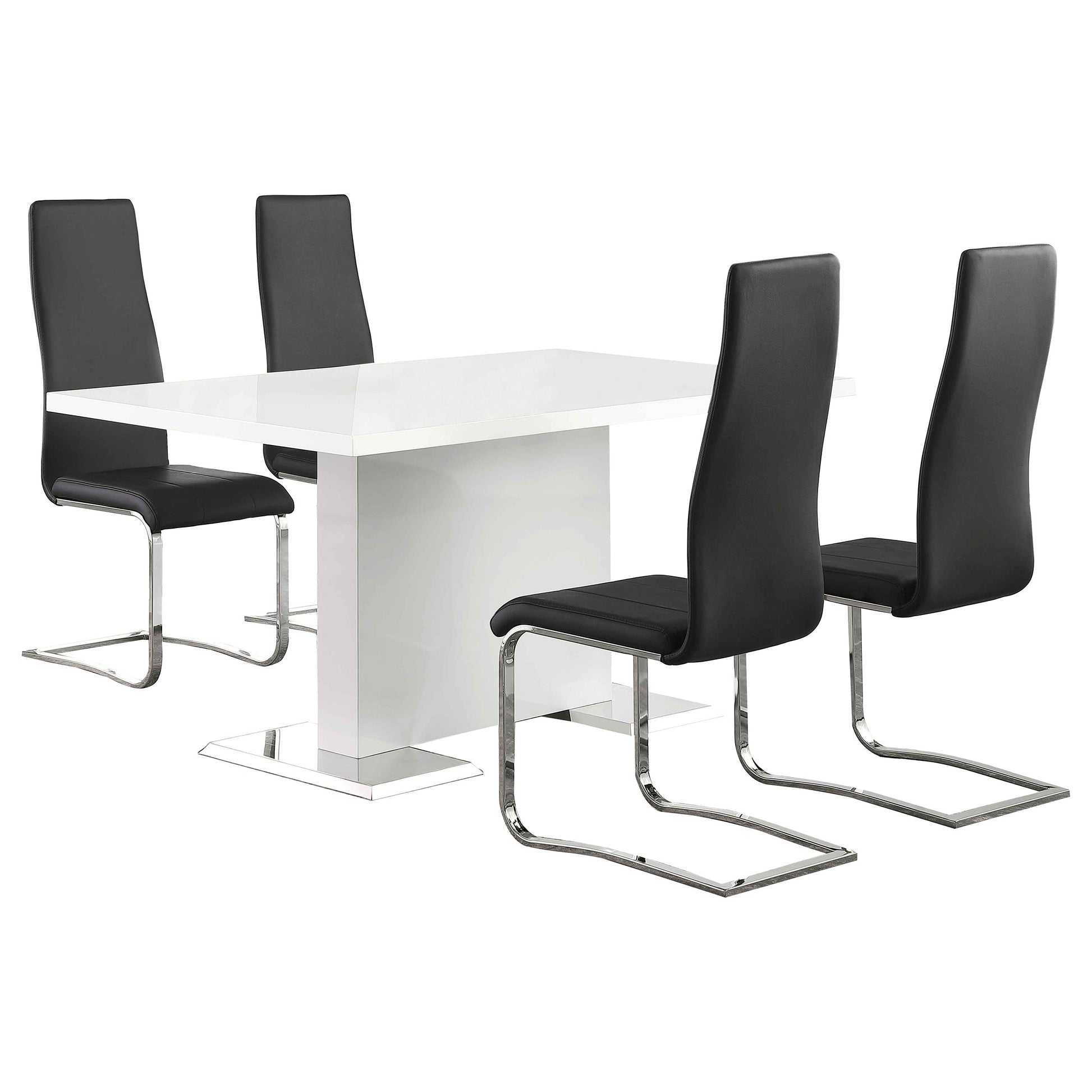 Elevate your dining area with the Anges 5-piece dining set. The contemporary white high gloss finished table features a chrome base for added shine. Complete the ensemble with our iconic Breuer-style chairs, showcasing an ergonomic curved backrest and foam-filled leatherette for ultimate comfort.