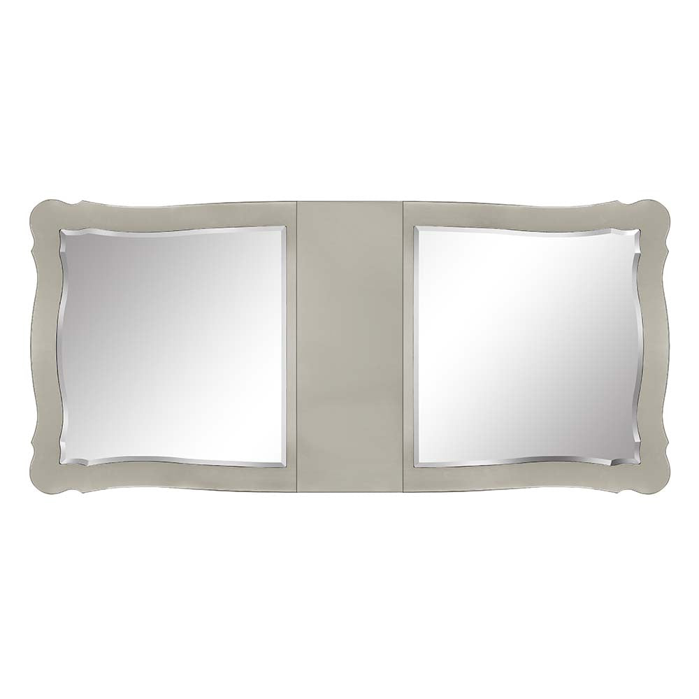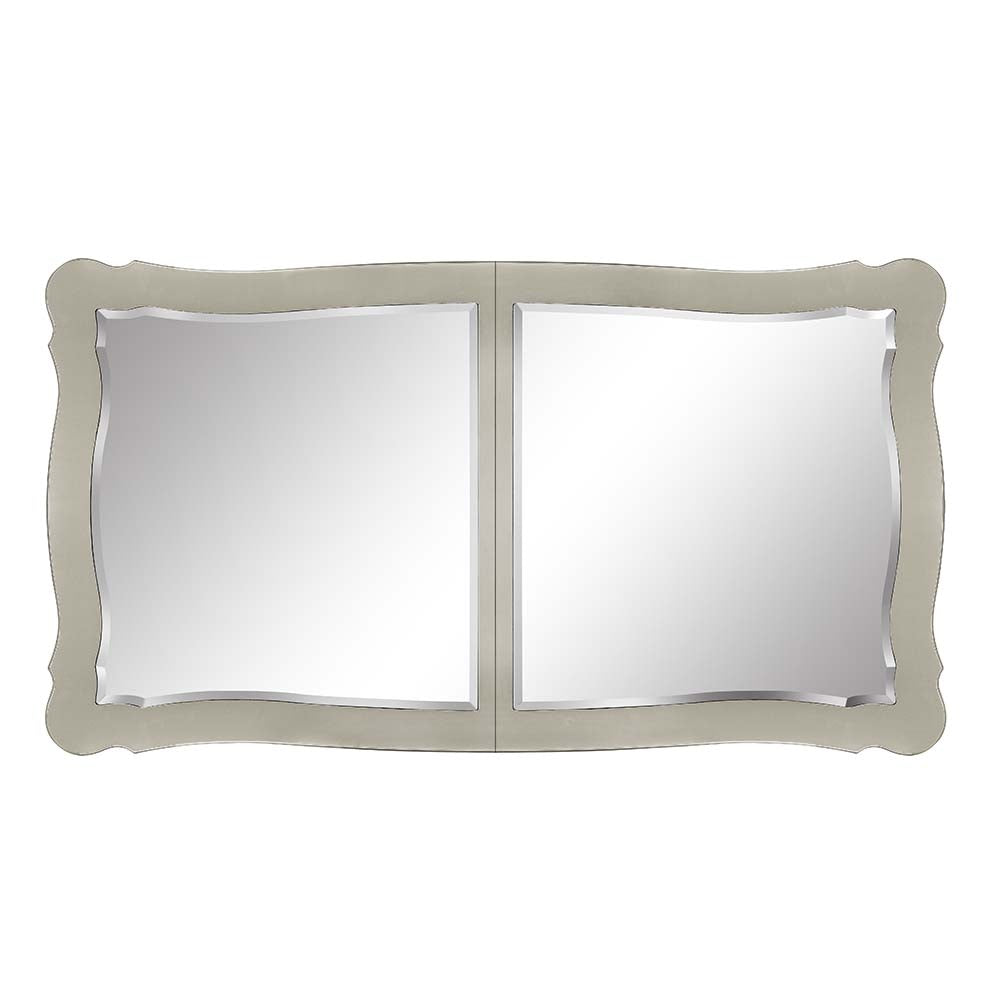 An ode to traditional glamour, the Devayne double pedestal dining table brings in all the allure and charm that you are seeking for a dining table. The table features an extension leaf that allows for additional dinner guests. The champagne finish enhances the beautiful floral moldings on the pedestals and apron. The tabletop features mirrored panels that highlight your dinnerware.