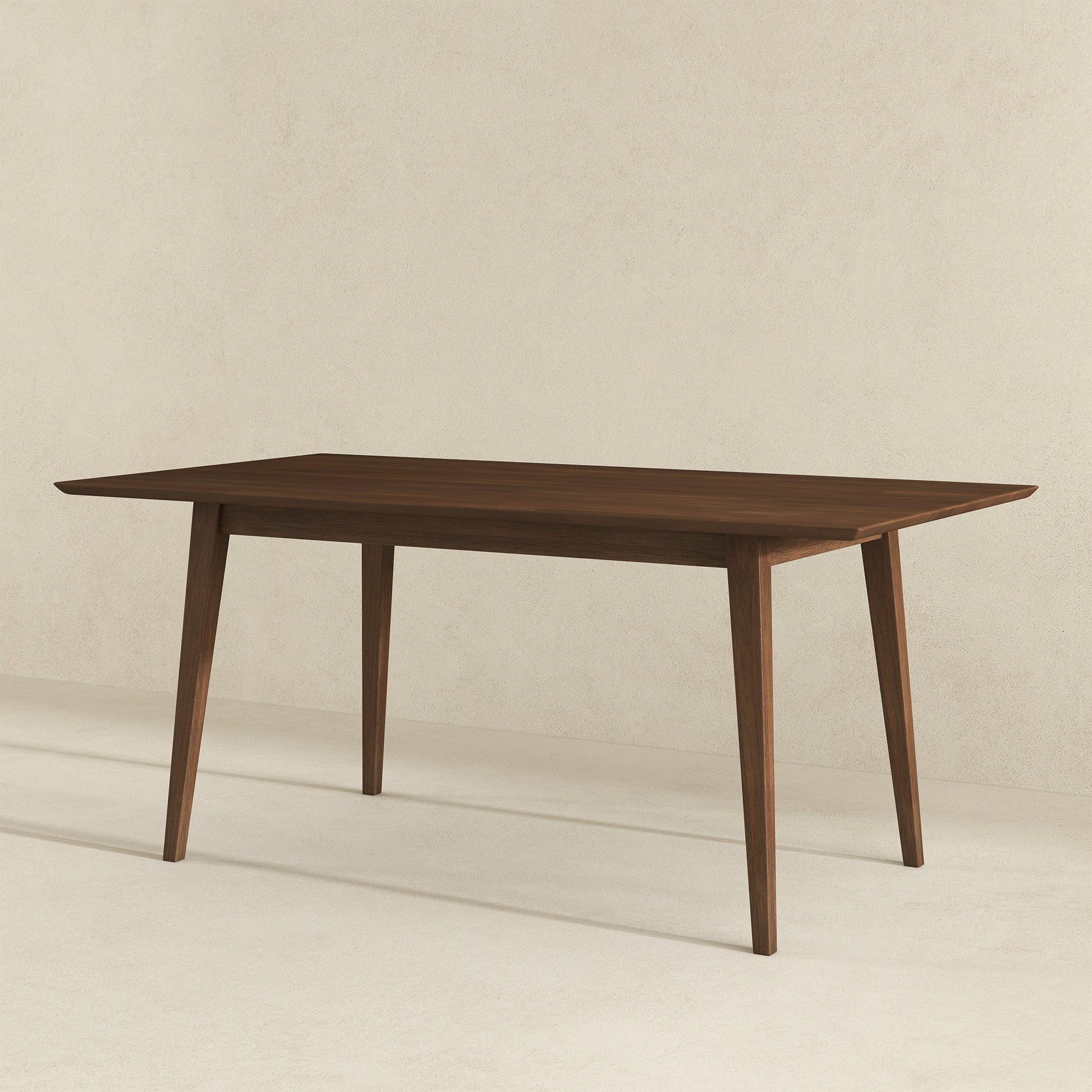 Introducing the Mary Mid-Century Rectangular 47-inch Solid Wood Dining Table in Brown. This exquisite mid-century modern furniture piece is the perfect addition to any dining room set. Crafted from durable and easy-to-clean wood, this rectangular dining table comfortably accommodates 4 chairs, making it ideal for breakfast or small kitchen sets. Inspired by modern design, its solid wood construction offers both style and wide seating space for each member. The beveled edges add a touch of safety, making it suitable for families with children and enhancing your overall design scheme. Its compact size allows for versatile placement in apartments, lofts, condos, and houses. It can be used as a living room table, kitchen breakfast table, or even a study desk in dorms and home offices. With its exceptional style and quality, this dining table offers great value for money, fitting into various budgets. The table is made of water-resistant solid wood, ensuring durability in wet and humid kitchen environments. The solid wood legs provide strength and can be easily repaired with a wood color touch-up pen. Assembly is a breeze, as you only need to attach the legs using the included tool and instructions. The thick walnut top with a reverse bevel edge adds a touch of elegance, and the table comfortably accommodates up to 6 adults. Its 100% kiln-dried wood structure guarantees long-lasting durability. Enjoy the convenience of very minimal assembly required, allowing you to swiftly set up your new dining table.