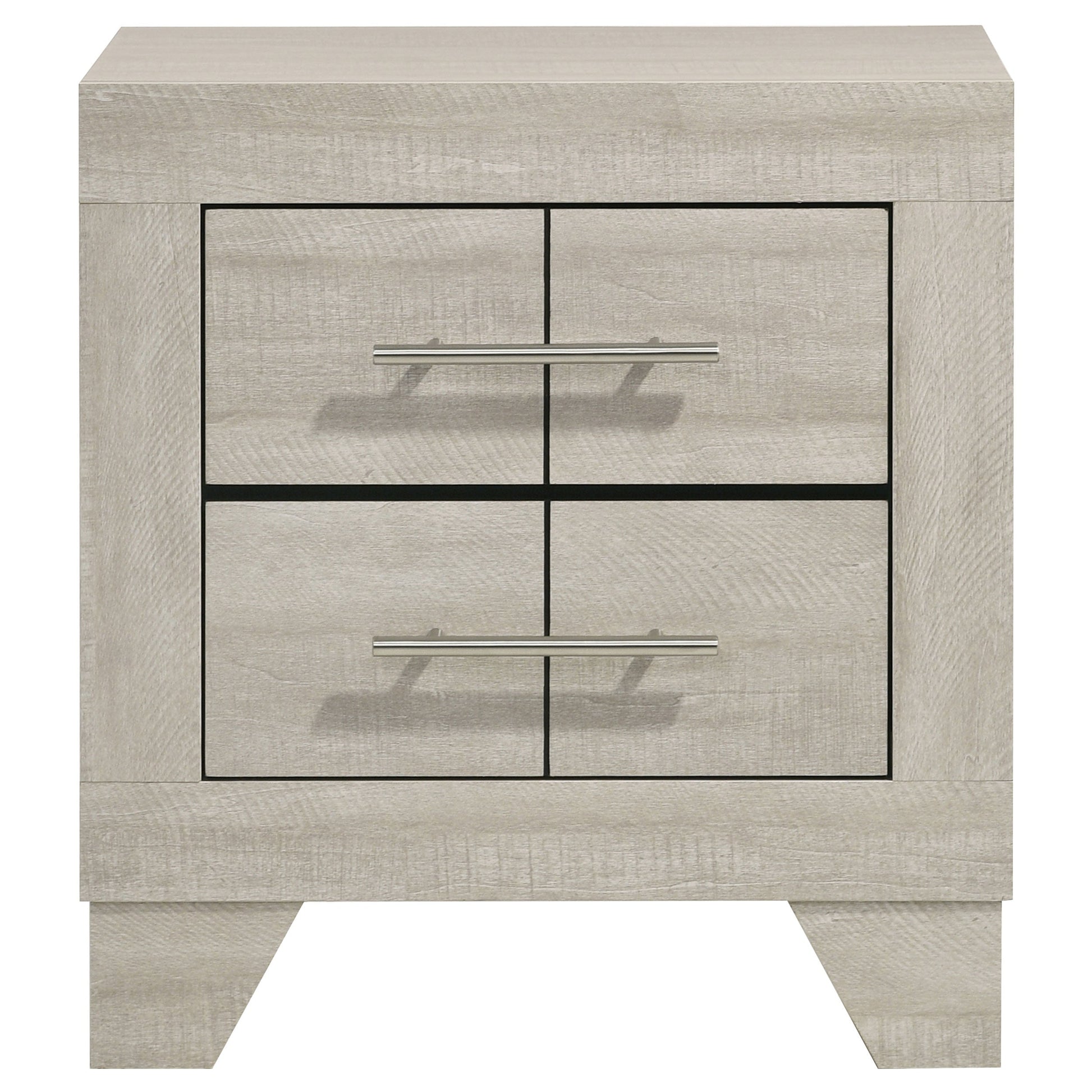 This contemporary two-drawer nightstand brings a chic blend of rustic and modern design to your bedside. Crafted with a rustic cream finish over rough-sawn, white-washed engineered paper veneer, it exudes a warm, textured appeal. Extra-wide polished nickel handles offer a sleek contrast to the rustic tones, adding a touch of sophistication. Built with engineered wood and featuring durable English dovetail joinery and Center metal glides, this nightstand is as functional as it is stylish, providing ample storage in a compact, modern silhouette.
