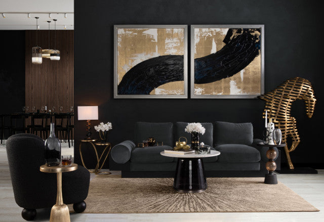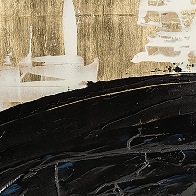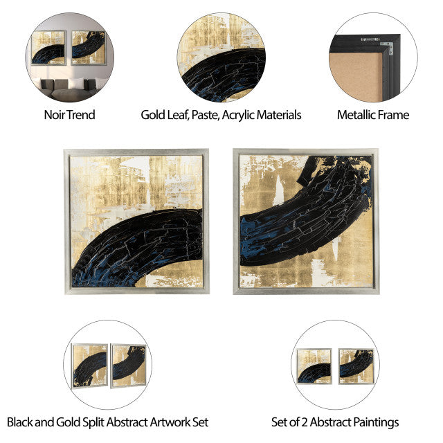 - Arte abstracto: Este conjunto de obras abstractas pintadas a mano con vetas negras presenta un fondo de pan de oro con una gran veta negra en espiral que recorre los marcos. Pinceladas aleatorias y gotas de blanco completan esta obra.