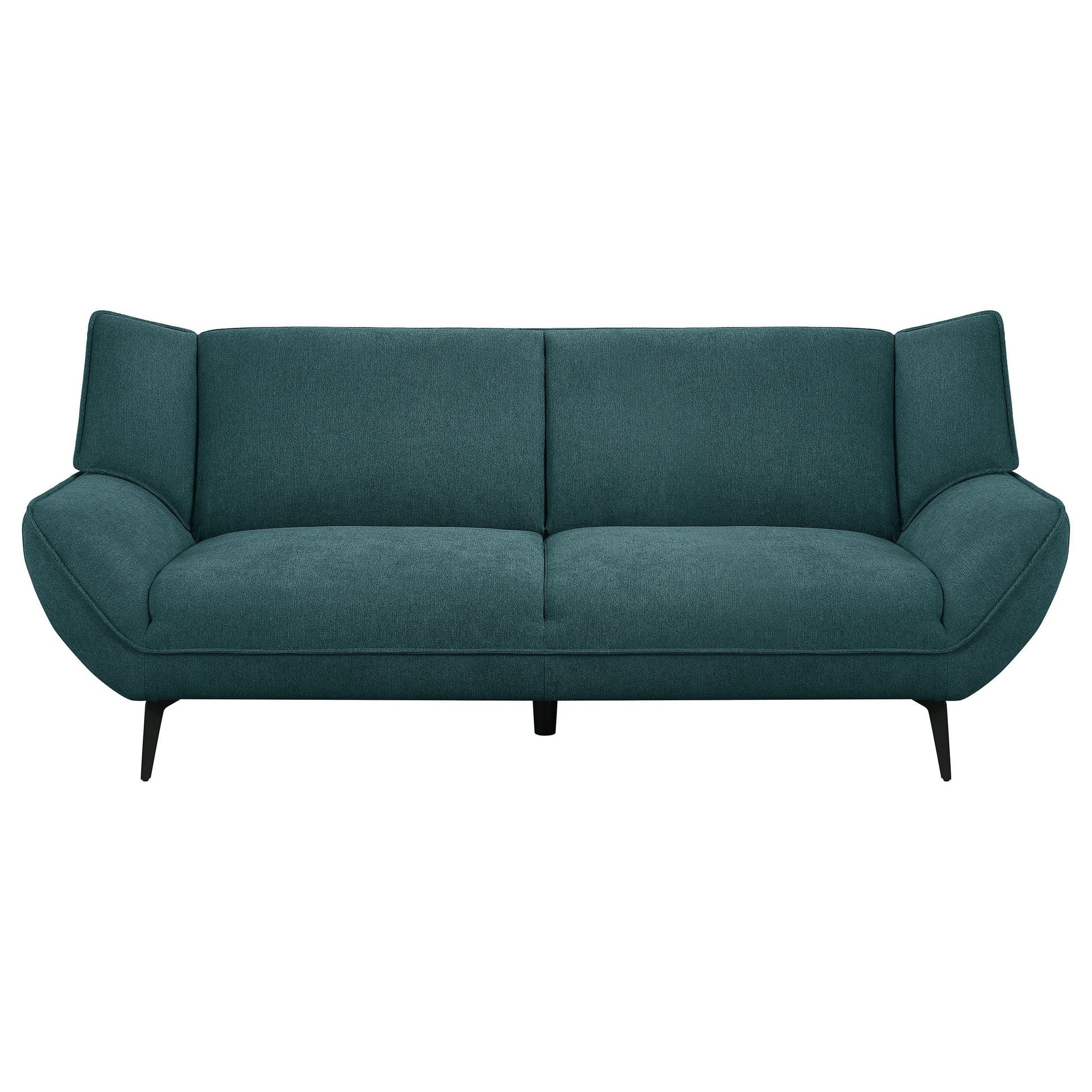 Un icónico diseño moderno de mediados de siglo quedará genial en tu sala de estar o estudio informal. Este cómodo y elegante sofá recrea elementos de diseño retro y garantiza una relajación fácil y cómoda. Su preciosa tapicería de tela verde azulado ofrece una amplia gama de opciones. Los brazos acampanados y los respaldos orejeros se fijan a los cojines fijos del asiento y el respaldo. Las patas cónicas de metal negro combinan con la hermosa tapicería verde azulado.