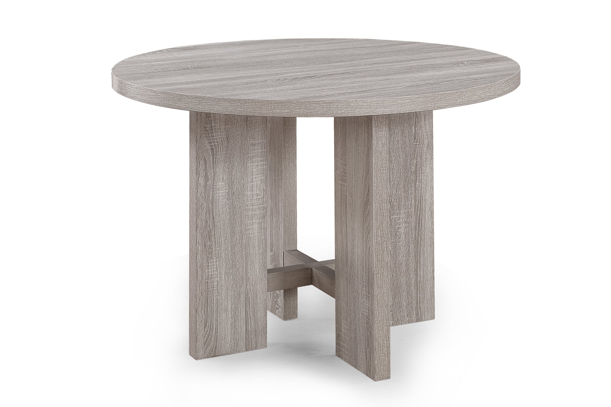This charming dining set exudes a coastal-inspired aesthetic, perfect for creating a light and airy dining atmosphere. The set centers around a round table with a weathered wood finish, offering a casual yet refined dining surface that invokes a sense of beachside serenity. Complemented by a set of elegantly crafted chairs, each piece showcases a gentle fabric upholstery in a calming neutral tone, providing comfortable seating that invites diners to linger longer. The chair backs' subtle curvature and the table's sturdy pedestal base combine to create a cohesive look that balances rustic textures with clean, contemporary lines. . Compact size Melamine finish Upholstered seat