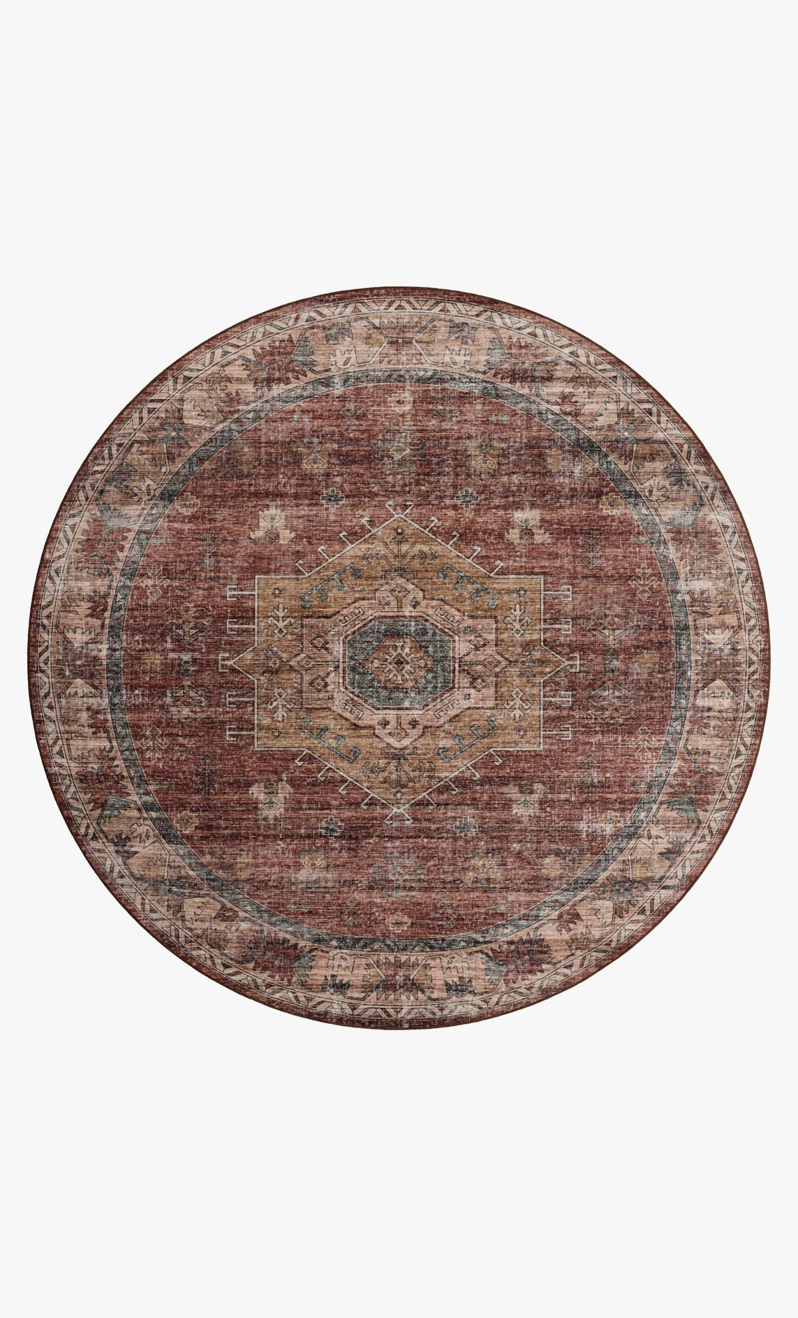 The Anniston Collection is a washable rug with traditional motifs in beautifully saturated and distressed tones. This durable area rug is power-loomed of polyester and designed for the busiest rooms of the home-living rooms, bedrooms, kitchens, hallways, and more. It can be washed in a home washing machine without an agitator, depending on the size. Any rug size 5' x 7'6" or smaller, including all runners, can fit into a washing machine that's 3.4 cubic feet or bigger; 6' x 9' rugs require a washer that's 4.2 cubic feet or bigger, 7'6" x 9'6" rugs require a washer that's 4.8 cubic feet or bigger, 9' x 12' rugs must be washed in a commercial washer with at least a 60-lb capacity. Wash in cold water, delicate cycle, with mild detergent, and no bleach, hang dry or lay flat to dry.