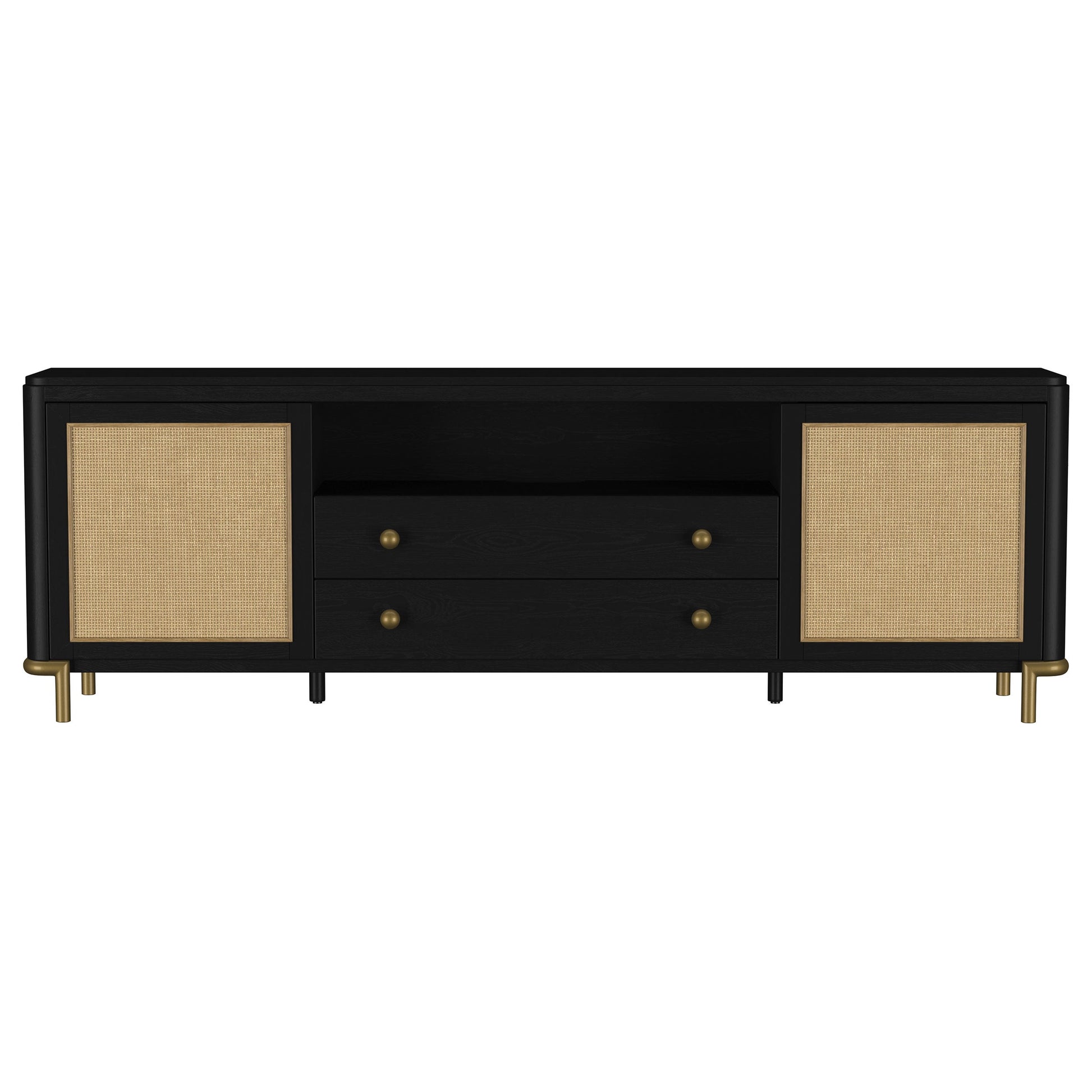 Este refinado mueble de entretenimiento transforma tu sala de estar con detalles artesanales. Con capacidad para pantallas de hasta 85 pulgadas, este mueble para TV combina madera dura asiática, madera de ingeniería, chapa de fresno y ratán. Su moderno acabado neutro y sus patas de latón envejecido irradian un encanto atemporal. Con cajones y almacenamiento oculto, es ideal como consola multimedia o estante para TV. Una versátil consola para TV y mueble para TV, garantiza un elegante centro de entretenimiento y un funcional mueble para TV.