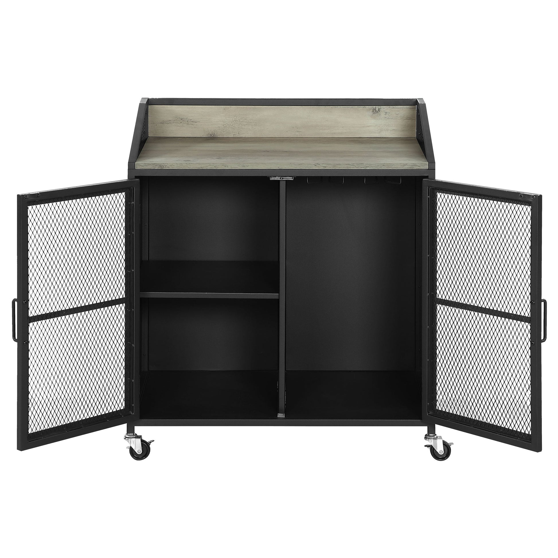 Esta vinoteca de estilo industrial ofrece amplio espacio para guardar sus cosechas favoritas, sacacorchos y accesorios. Diseñada con un acabado en polvo negro arena sobre una resistente estructura de acero, esta funcional vinoteca se adapta a una casa de campo moderna o a un loft contemporáneo con espacio limitado. Con ruedas, esta vinoteca se adapta a cualquier espacio de la casa. Su superficie gris lavada invita a exhibir con orgullo la decoración y la cristalería de temporada. Además, un armario inferior de dos puertas con paneles de alambre transparentes permite guardar con orden las copas y otros artículos esenciales para servir vino.