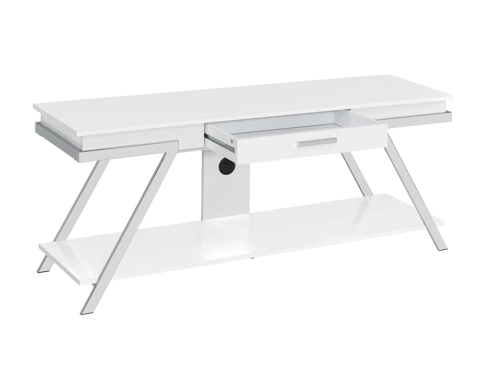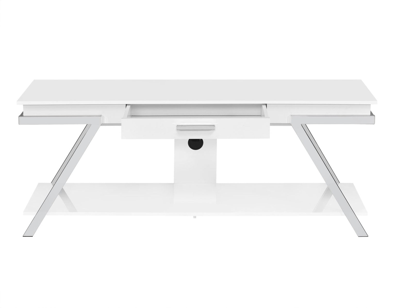 - El cajón de trabajo tiene guías laterales de metal y brinda almacenamiento para controles remotos, cables u otros elementos esenciales de entretenimiento.