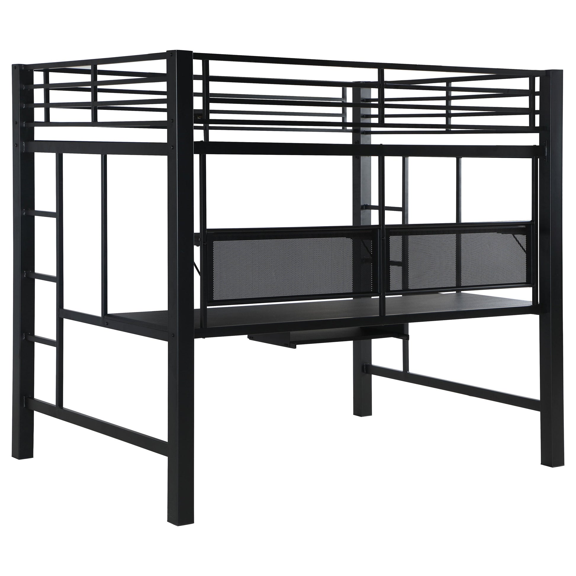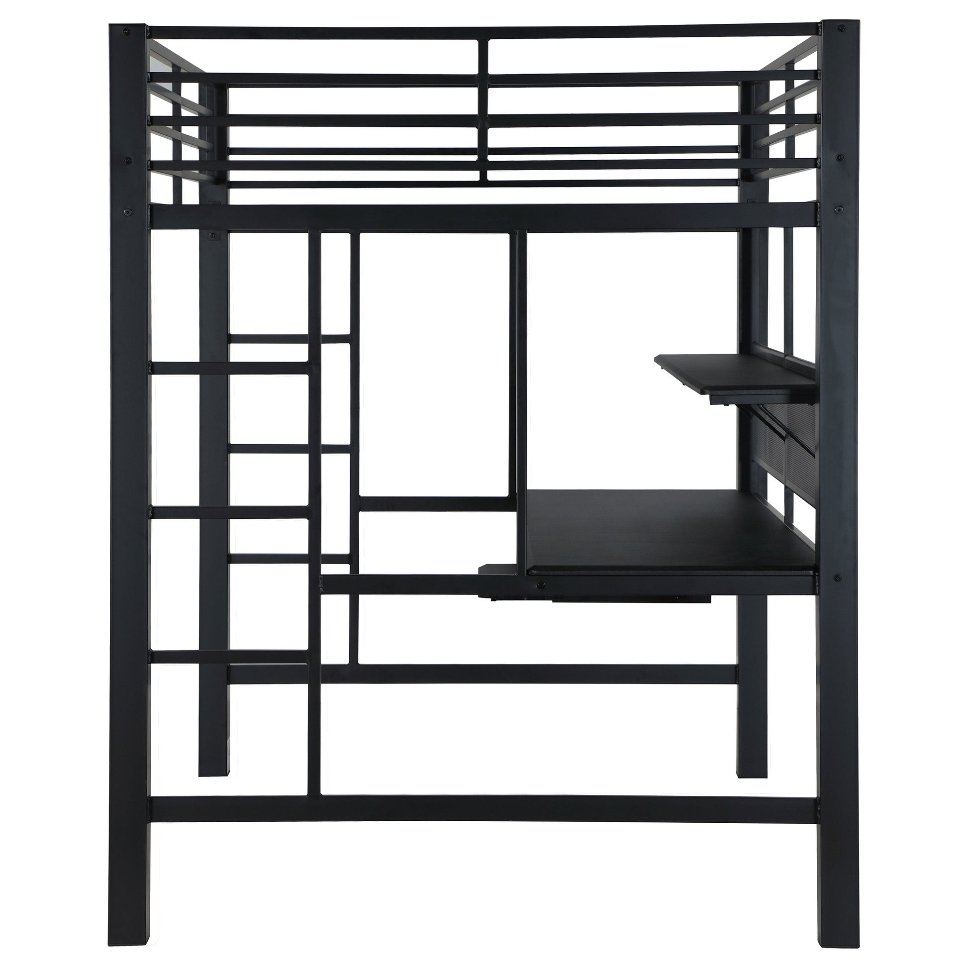 Para los adictos al trabajo que nunca dejan de pensar en su próxima gran innovación, esta cama alta para estación de trabajo es una bendición. Combine trabajo y descanso de forma moderna con una sofisticación demostrable. La cama alta de metal tiene un acabado negro. Debajo de la cama se encuentra un área de trabajo que incluye un escritorio con bandeja para el teclado y un estante de almacenamiento. Una adición encantadoramente contemporánea a cualquier espacio, especialmente a un loft.