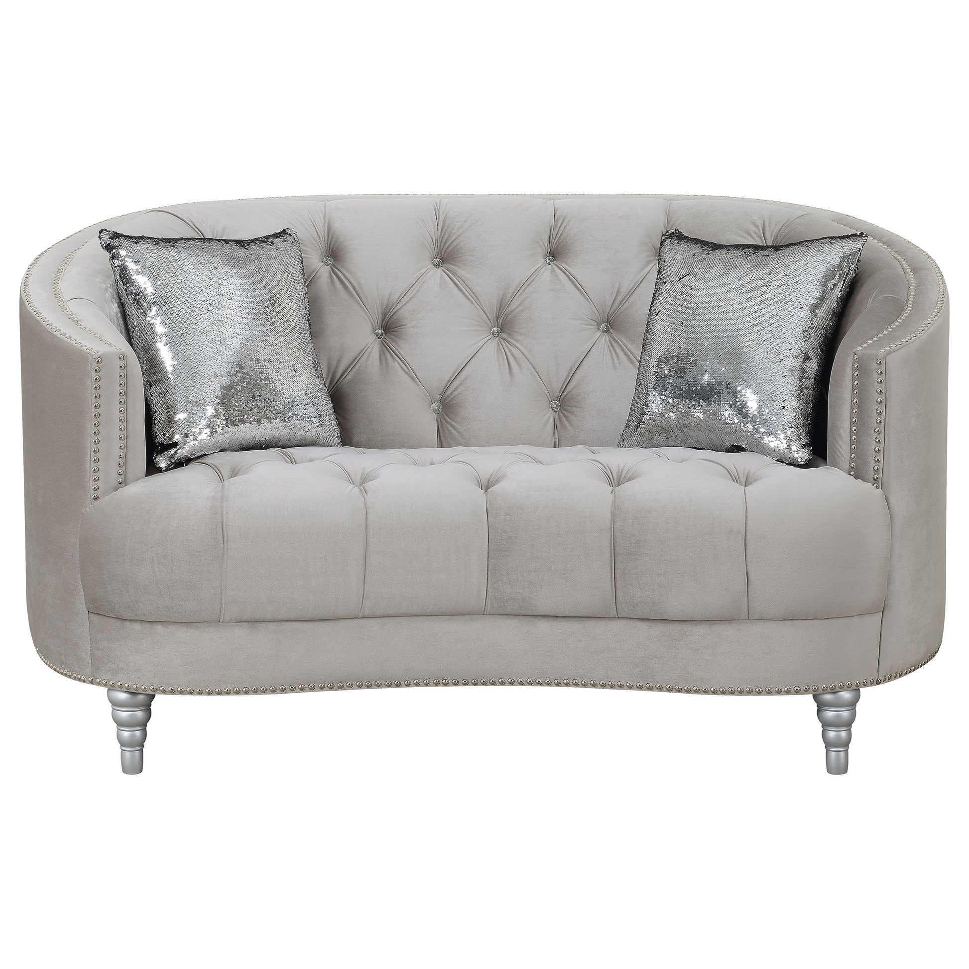 Luce tu elegante estilo con este elegante y sofisticado loveseat. Con una encantadora silueta curva, irradia un gusto refinado y un encanto clásico. Su suave tapizado en gris apagado combina a la perfección con una variedad de paletas de colores. Su hermoso capitoné y sus llamativos ribetes de tachuelas dan vida a su diseño tradicional. Perfecto para una sala de estar o un gran salón, este loveseat es una opción glamurosa.