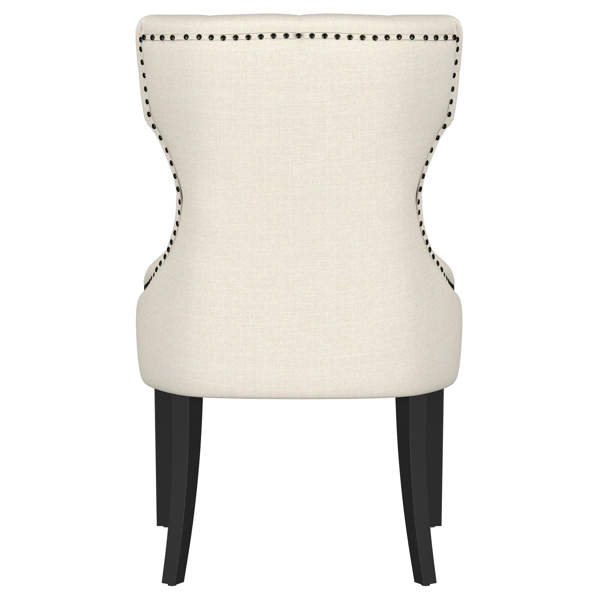 Cree un comedor excepcional y acogedor con una moderna silla de comedor capitoné con botones. Combina un perfil clásico de respaldo alto con una suave curvatura, ofreciendo una comodidad impecable y un estilo elegante. Su lujoso respaldo y asiento cuentan con acolchado de espuma y un suave tapizado, ofreciendo una experiencia placentera a todos los comensales. El respaldo incluye un ribete de tachuelas que le da un toque dimensional. Las patas negras completan el estilo con sobriedad y un excelente soporte.