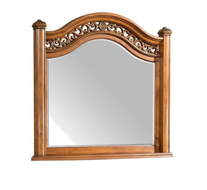 El juego de espejos cuadrados Barkley presenta un clásico acabado en roble cálido. Esta imponente pieza está adornada con intrincados trabajos en metal en el espejo y elegantes patas estriadas.CP0213