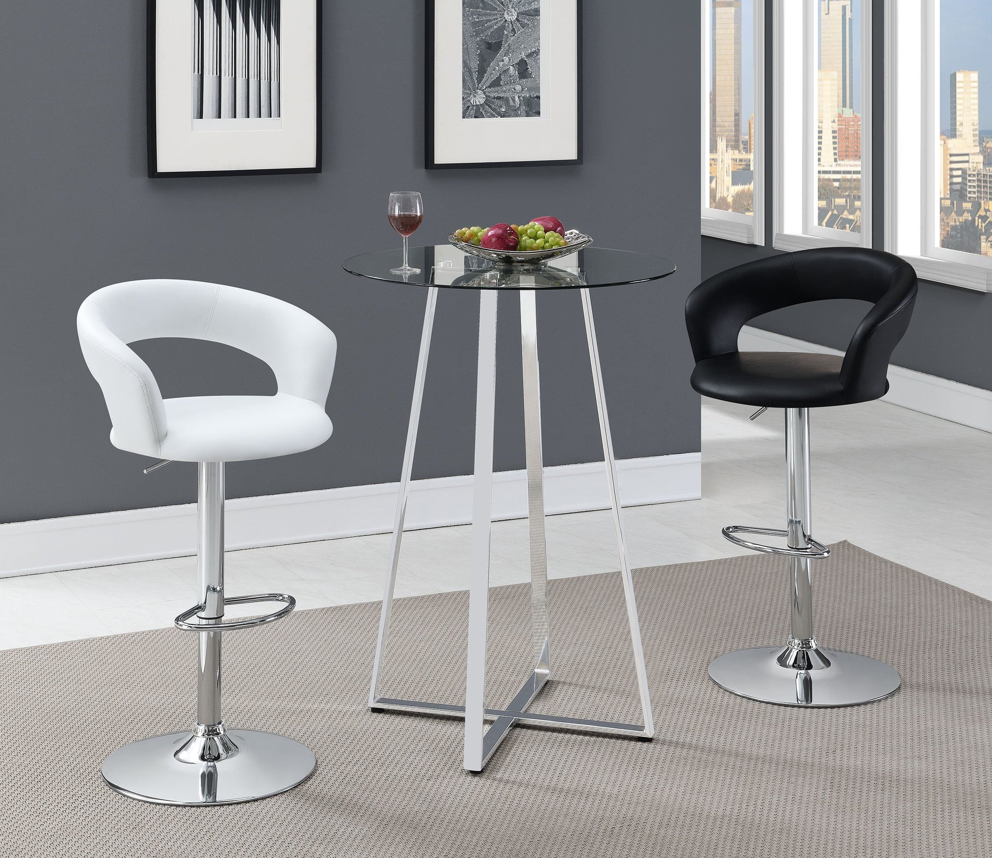 Este taburete de bar de altura ajustable cuenta con un asiento tapizado en piel sintética negra sostenido por una base cromada, que irradia una sensación de estilo duradera.