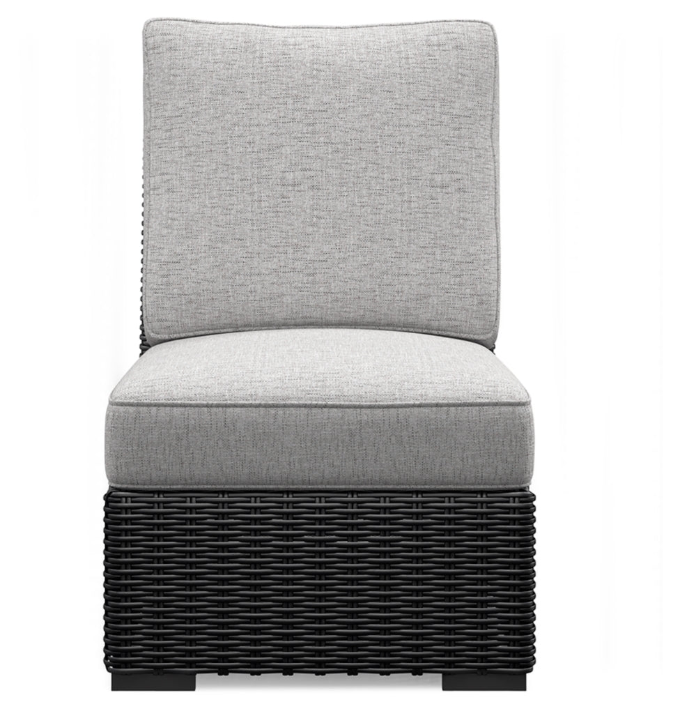- Includes 5 pieces with cushions: 2-piece loveseat, curved corner chair and 2 armless chairs