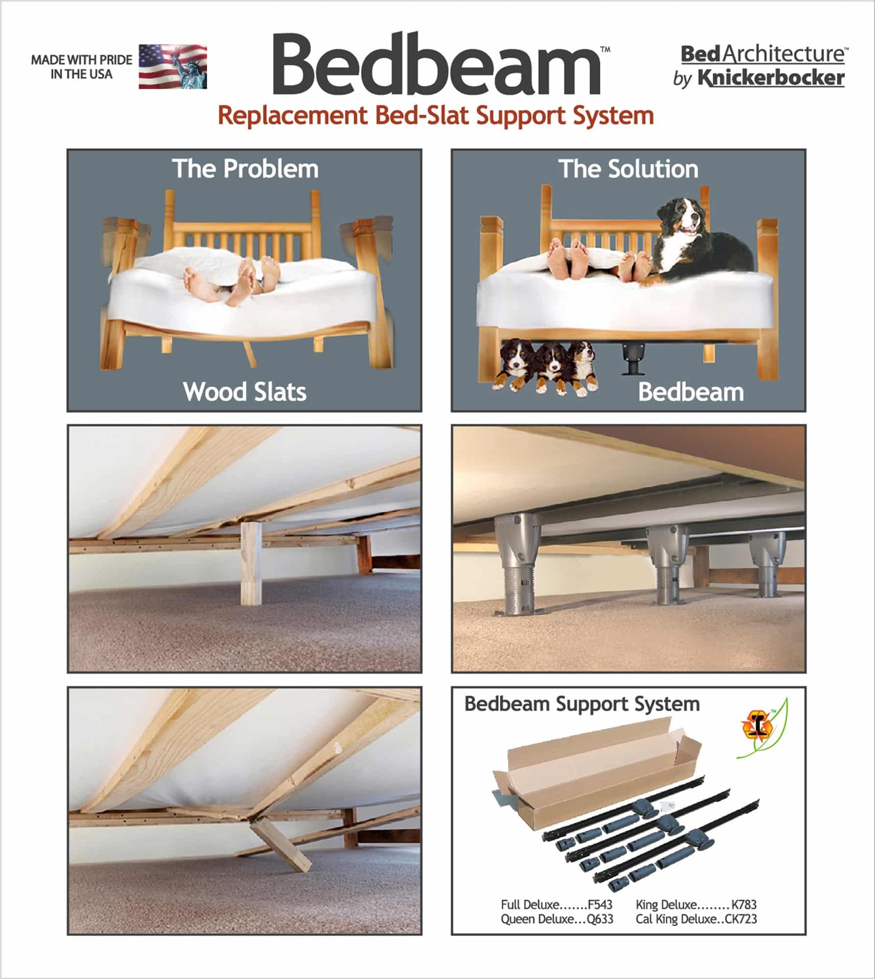 The Bedbeam™ Steel Slat System (3 Legs) is the strongest support system you can buy for your mattress and box spring. This deluxe support system can be purchased for a full, queen, king, or california-king-sized wooden bed. Installation is fast and easy. The Bedbeam™ will protect your mattress warranty and can support over 1600lbs of weight! Your mattress and box spring will sit very securely on top of this heavy-duty all American product. The Bedbeam adjusts between 5 and 18 inches in height.
