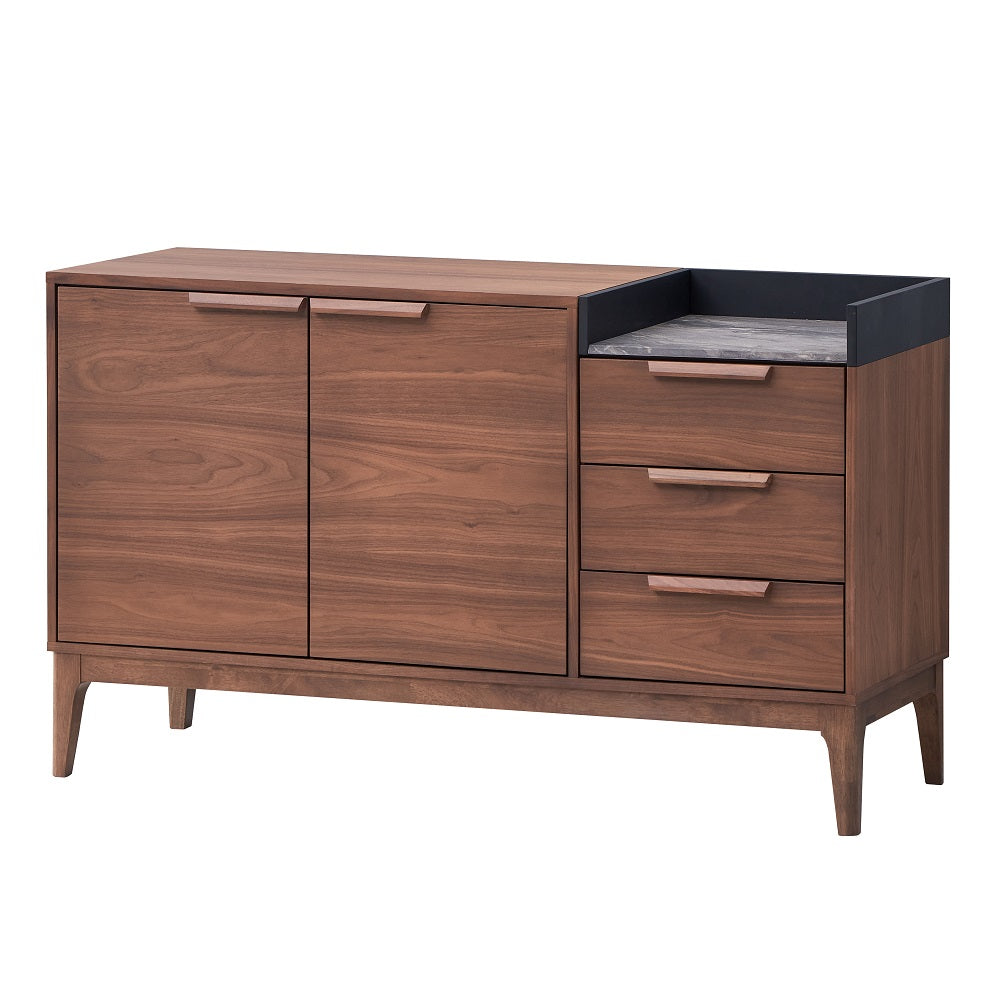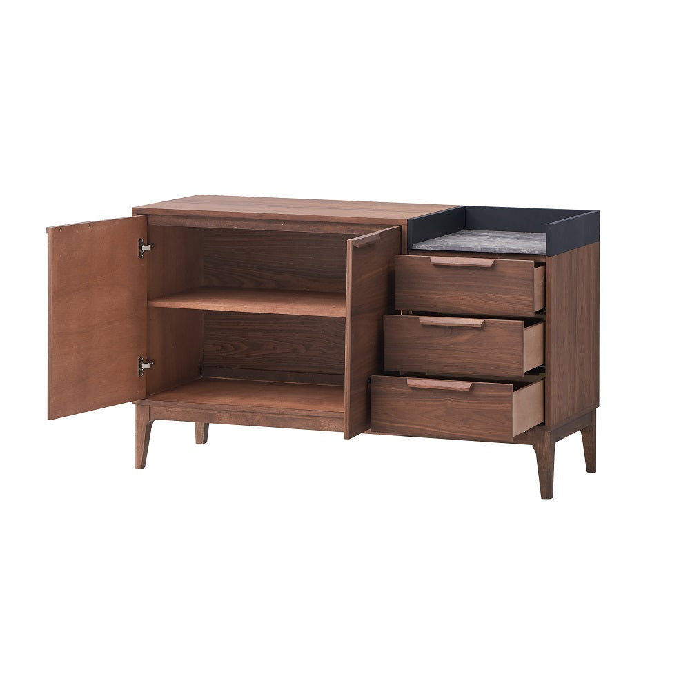 Este servidor Bevis, de inspiración moderna de mediados de siglo, es ideal para quienes buscan un diseño minimalista con un toque de estilo. Cuenta con un amplio armario lateral ideal para botellas de vino y vajilla. Los cajones laterales son ideales para organizar el espacio y guardar cápsulas de café. El tablero cuenta con un inserto de piedra artificial, perfecto para una cafetería en casa.