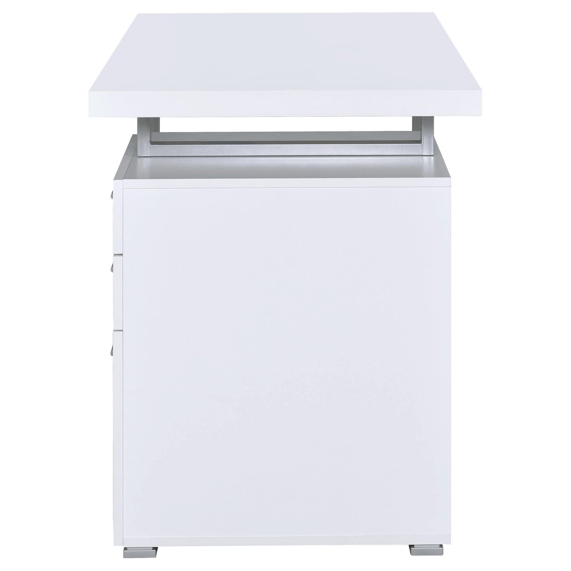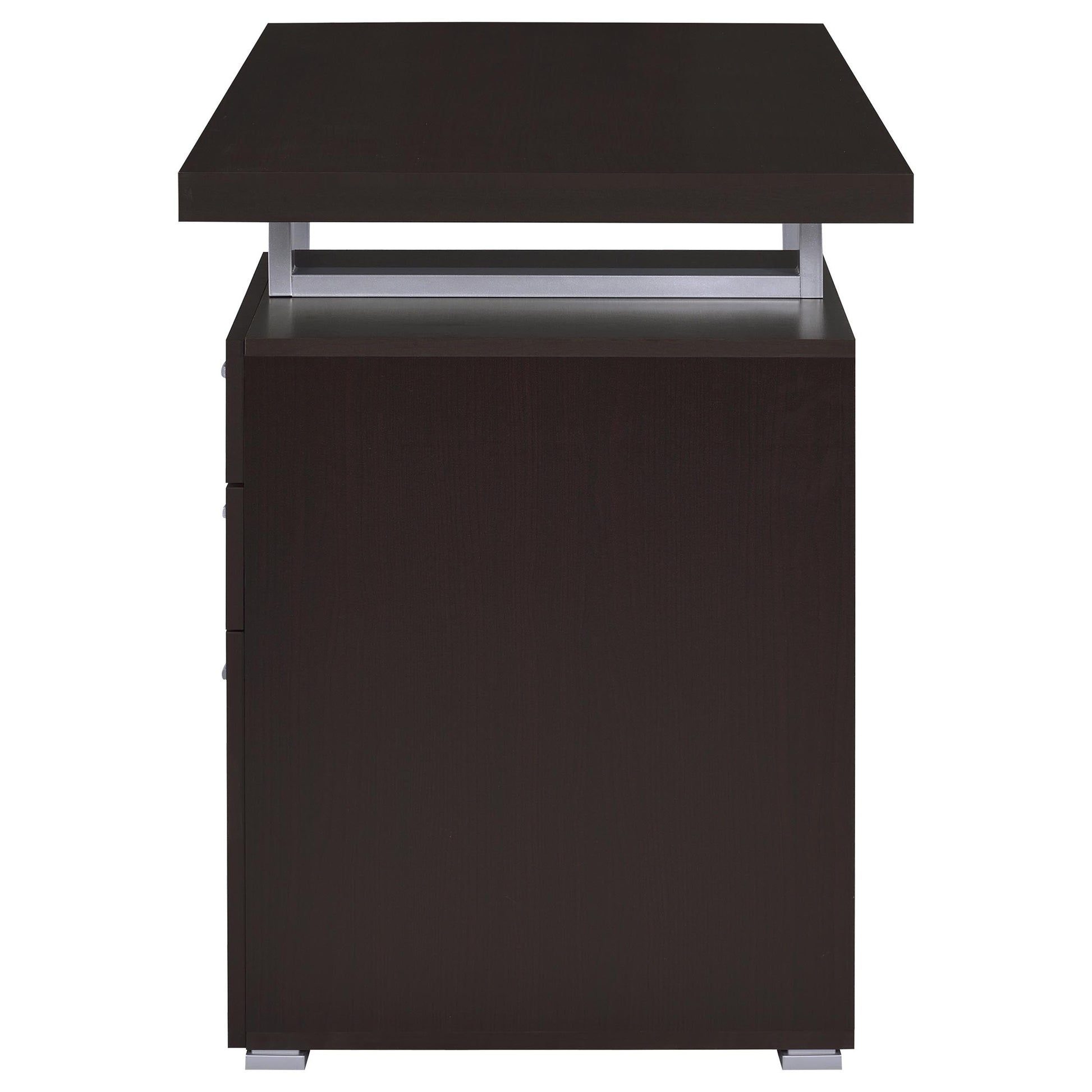 Este escritorio de oficina es una excelente opción para quienes prefieren el orden y la organización. Sus tres amplios cajones incluyen un archivador para guardar de forma segura archivos de tamaño legal y carta. Fabricado en acero y otros materiales duraderos, ofrece una amplia superficie para trabajar, estudiar o mantenerse al día con las redes sociales. Su precioso acabado capuchino intenso contrasta con elegancia con su elegante estructura plateada, creando un aspecto contemporáneo sumamente atractivo. Este escritorio también está disponible en blanco y gris envejecido para opciones aún más atractivas.