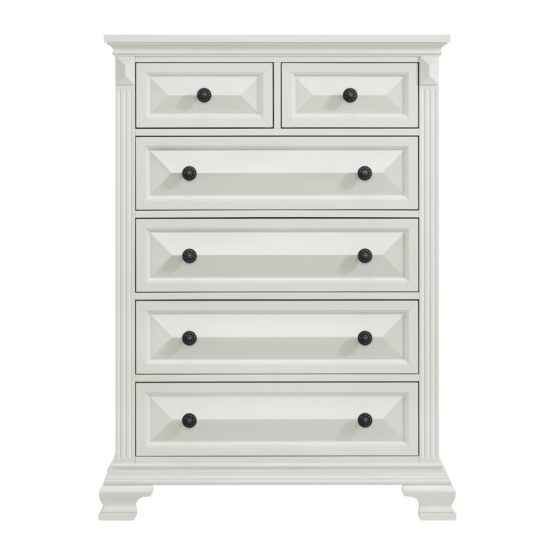 The Bridgestone 6-Drawer Chest in Antique White is the perfect addition to any bedroom. This case piece is designed with beautiful beveled design throughout, adding a touch of elegance to your decor. It features a beautiful off-white finish, while the metal knob hardware adds a contrasting touch. The top drawers are lined with grey felt to protect delicate items, while the bottom drawer features cedar veneer for added durability. With ball bearing drawer guides and an anti-tipping kit included, this chest is as functional as it is stylish. Bring sophistication and organization to your bedroom with this piece from the Bridgestone collection.