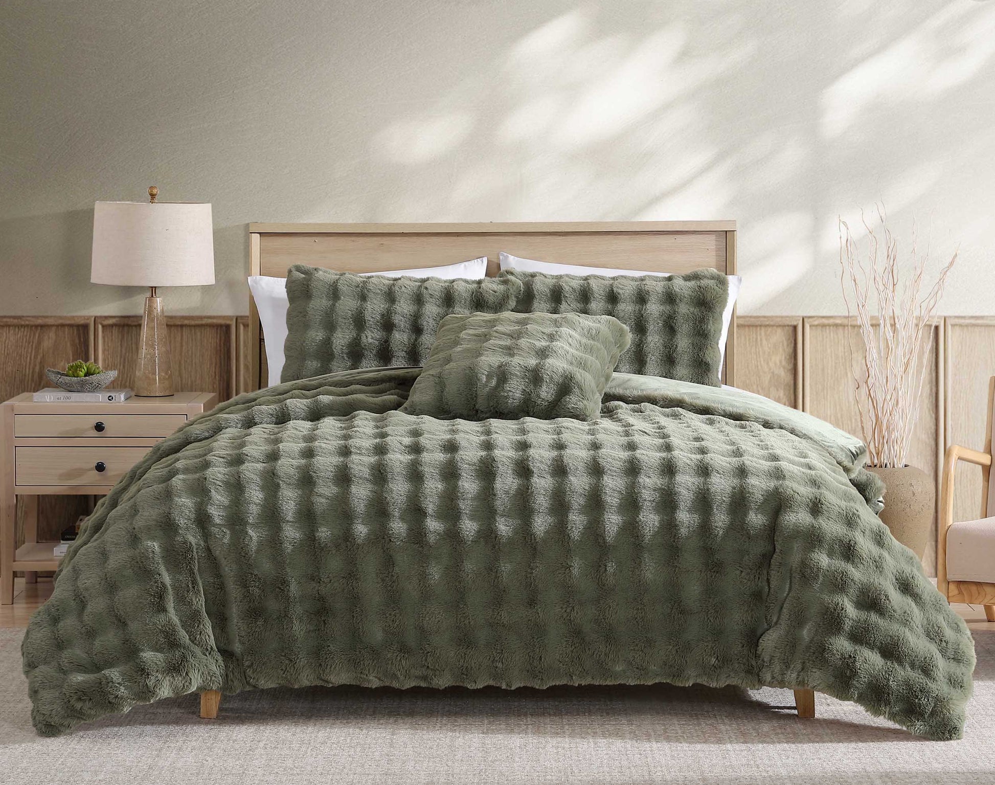 Experience cozy luxury with the Bubble Faux Fur Green 4 pc Comforter Set. Featuring a unique bubble-like design in soothing green and moss tones, this set adds texture and warmth to your bedroom. Soft to the touch and visually inviting, it transforms your space into a relaxing retreat.