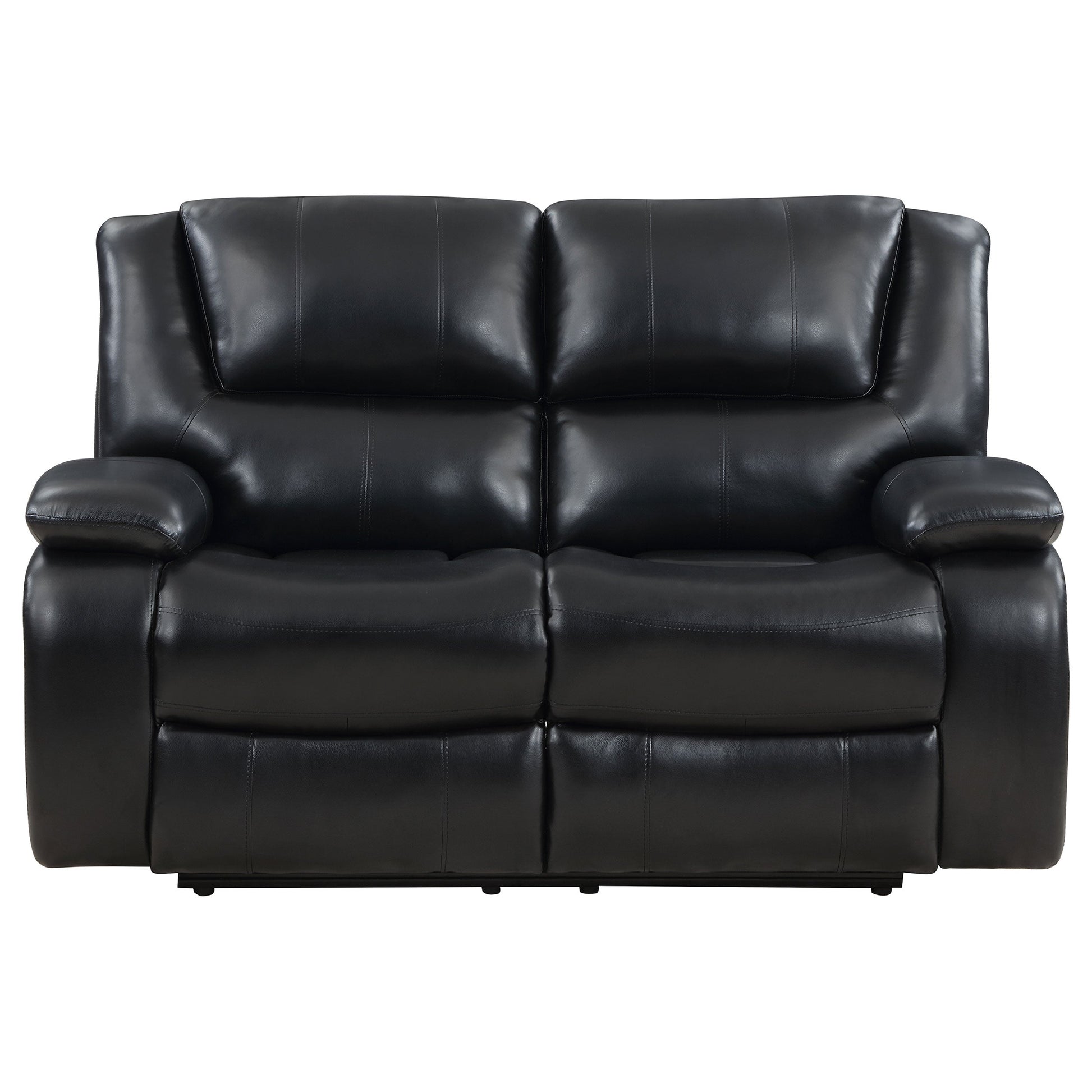 La tapicería de polipiel negra audaz ofrece la apariencia de un cuero lujoso con un mantenimiento sencillo, ya que este loveseat móvil es versátil y hermoso. Salas de estar, salas familiares y salas de entretenimiento se convierten en zonas de confort con la sensación de confort y el diseño limpio de un loveseat clásico, diseñado para horas de comodidad y entretenimiento. La reclinación manual es fácil y placentera, permitiendo diversas posiciones para sentarse y relajarse. Elija este elegante loveseat con un soporte mullido, ya que los cojines del asiento y el respaldo cuentan con un relleno de espuma suave con canales para una mayor comodidad corporal y reposabrazos acolchados con bordes redondeados. Disfrute con estilo y comodidad absoluta con un loveseat móvil, ideal también para relajarse solo y tomar una siesta.