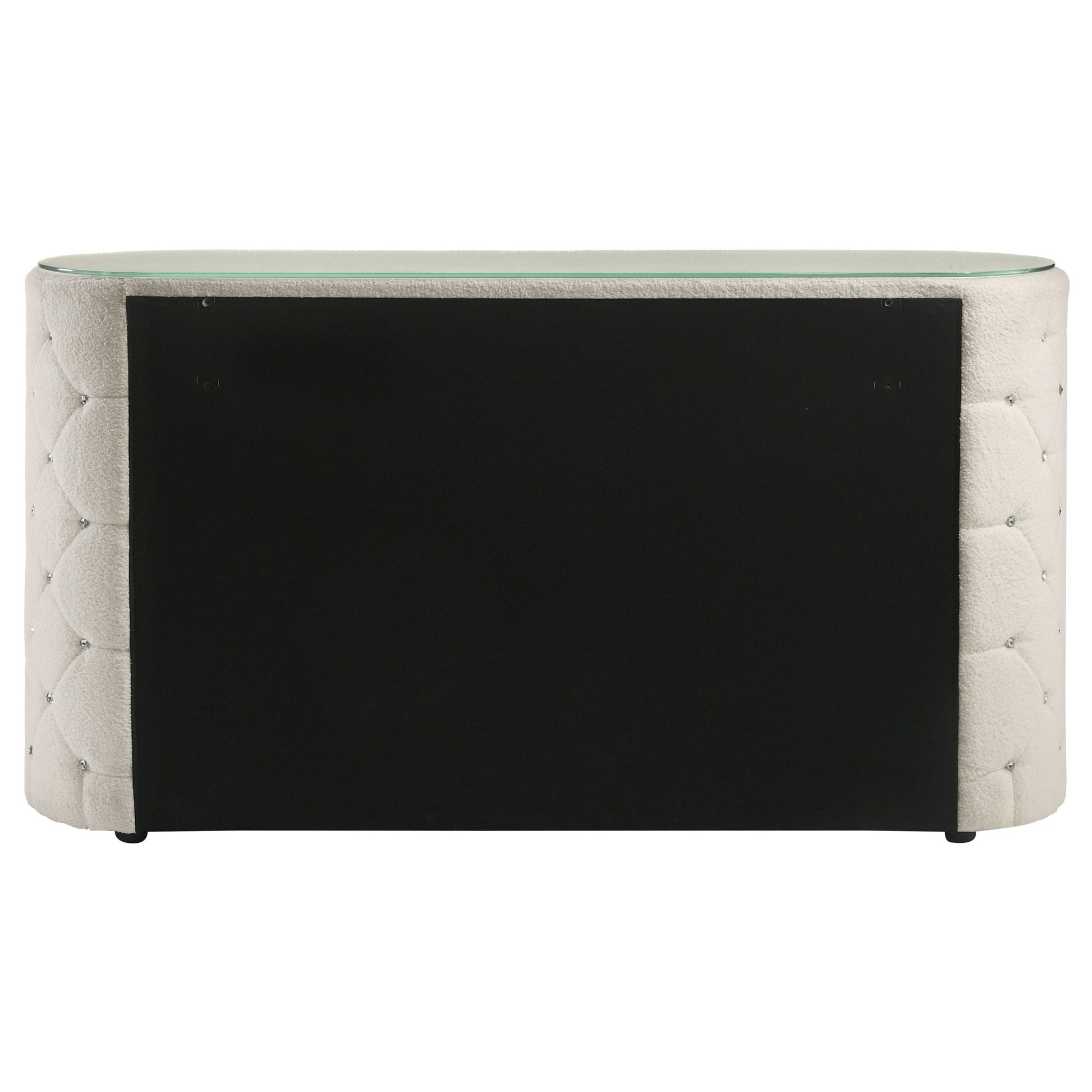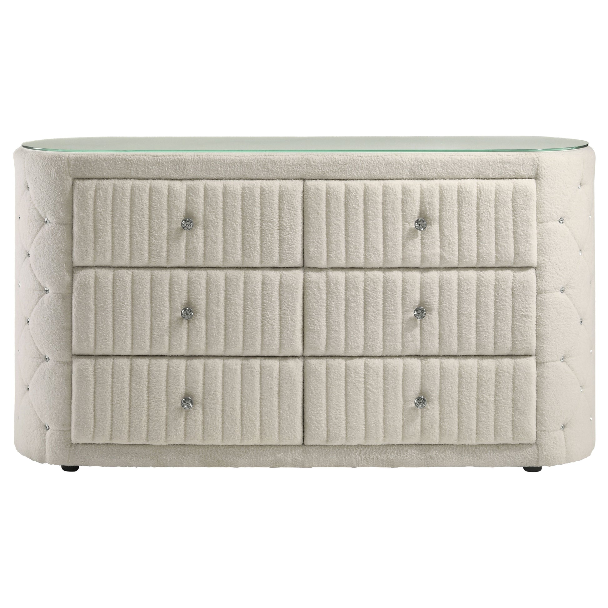 Soft texture meets luminous detail in this statement-making dresser. Wrapped in ivory boucle, the piece features vertical channeling across six spacious drawers, each adorned with crystal-inspired hardware for a hint of sparkle. Diamond tufting along the sides adds depth and dimension, while a clear tempered glass top provides a smooth surface without concealing the luxe upholstery. With its elegant form and functional storage, this dresser elevates everyday routines.