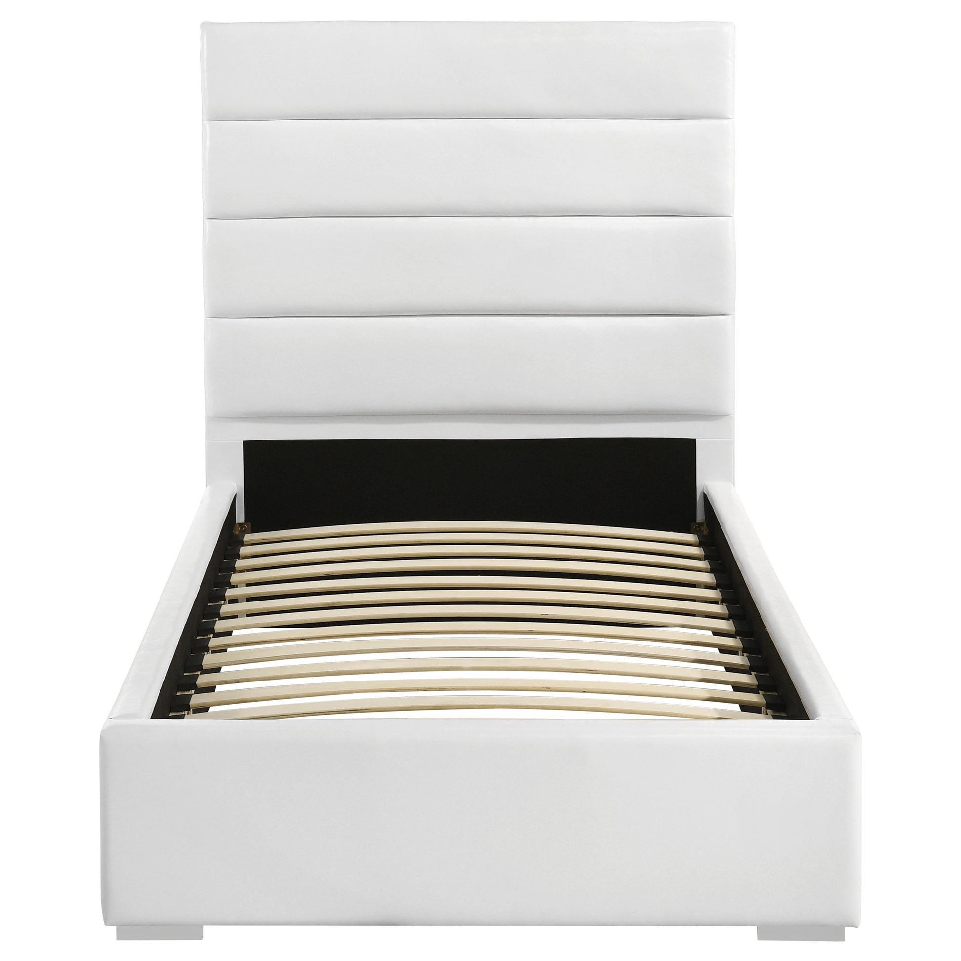 Elevate your bedroom with this modern upholstered bed featuring clean lines and a minimalist design. Wrapped in white faux leather, the panel headboard showcases horizontal channeling for a sleek and contemporary look. The sturdy frame includes slat support, eliminating the need for a box spring while ensuring mattress stability. Crafted from durable materials, this bed combines engineered wood and metal for lasting reliability. Perfect for creating a crisp, modern ambiance in any bedroom.