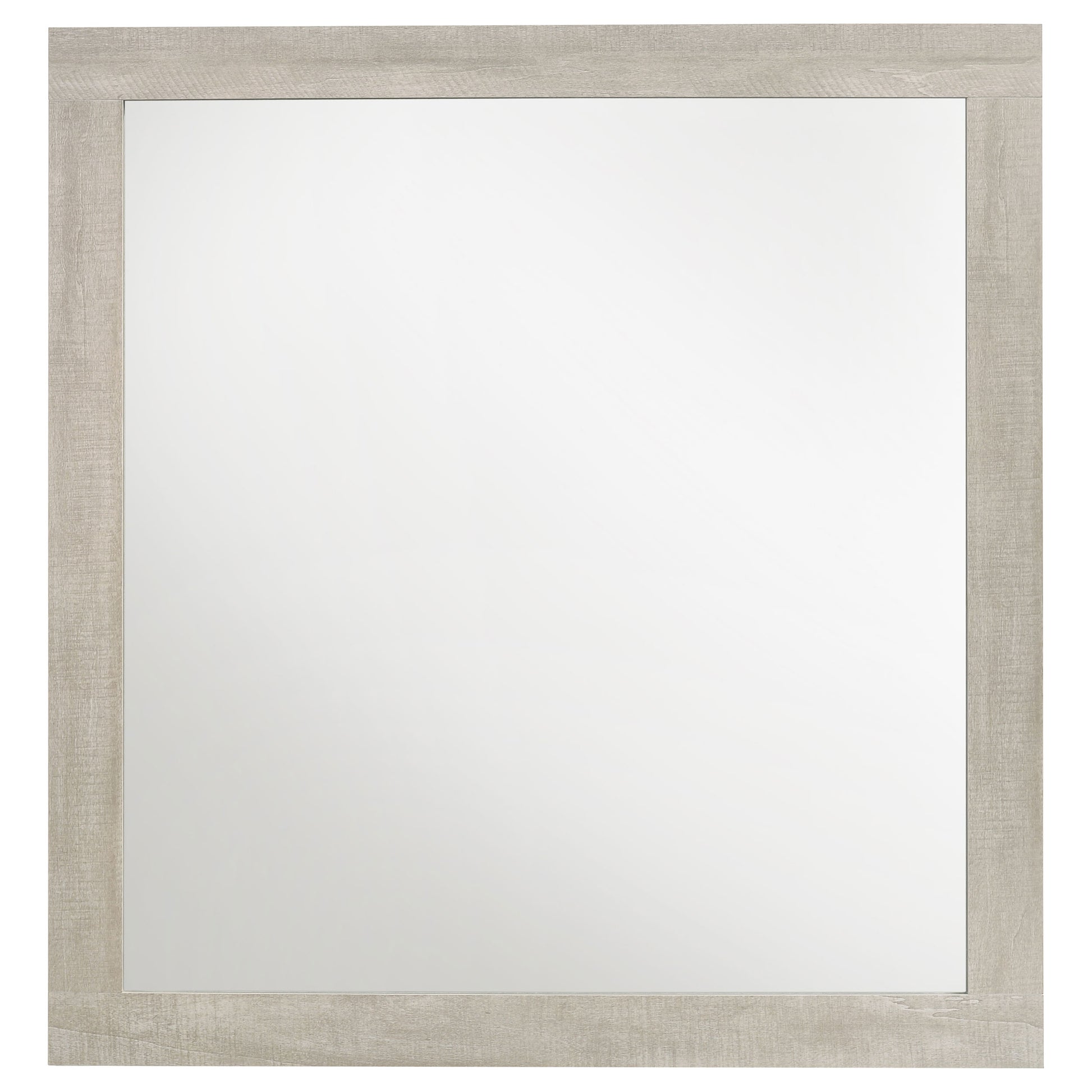 This contemporary mirror adds a refined touch to any bedroom with its clean, minimalist frame and rustic cream finish. Crafted with a rough-sawn, white-washed engineered paper veneer, it complements the dresser with its understated elegance. The mirror not only enhances the roomÕs brightness but also adds a sense of depth, making spaces feel more open and inviting. Perfectly suited for modern and rustic-inspired interiors, this mirror is the ideal finishing piece for a well-rounded bedroom setup.