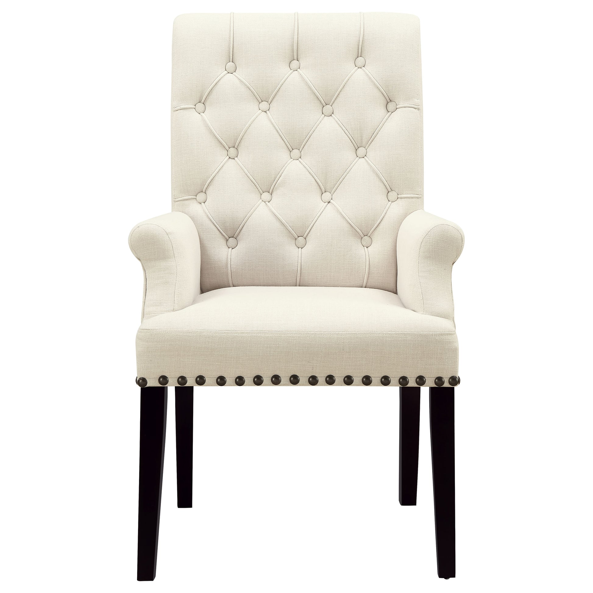 Designed for both luxury and support, this arm chair brings an elegant presence to any dining space. Its button-tufted high back and rolled top lend a timeless aesthetic, while the addition of padded armrests enhances comfort. Hand-applied nailhead trim offers a sophisticated finishing touch, complementing the chairÕs tailored silhouette. A generously padded seat and sturdy legs ensure both durability and long-lasting comfort, making it a stunning choice for formal and everyday dining alike.
