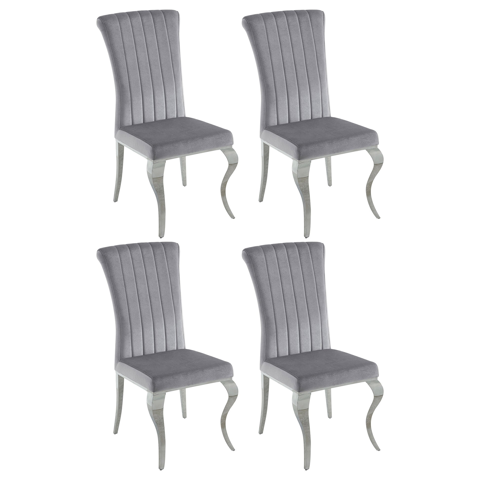 Sleek black or chic grey velvet upholstery lends plush softness to the roll back design of the side chairs
