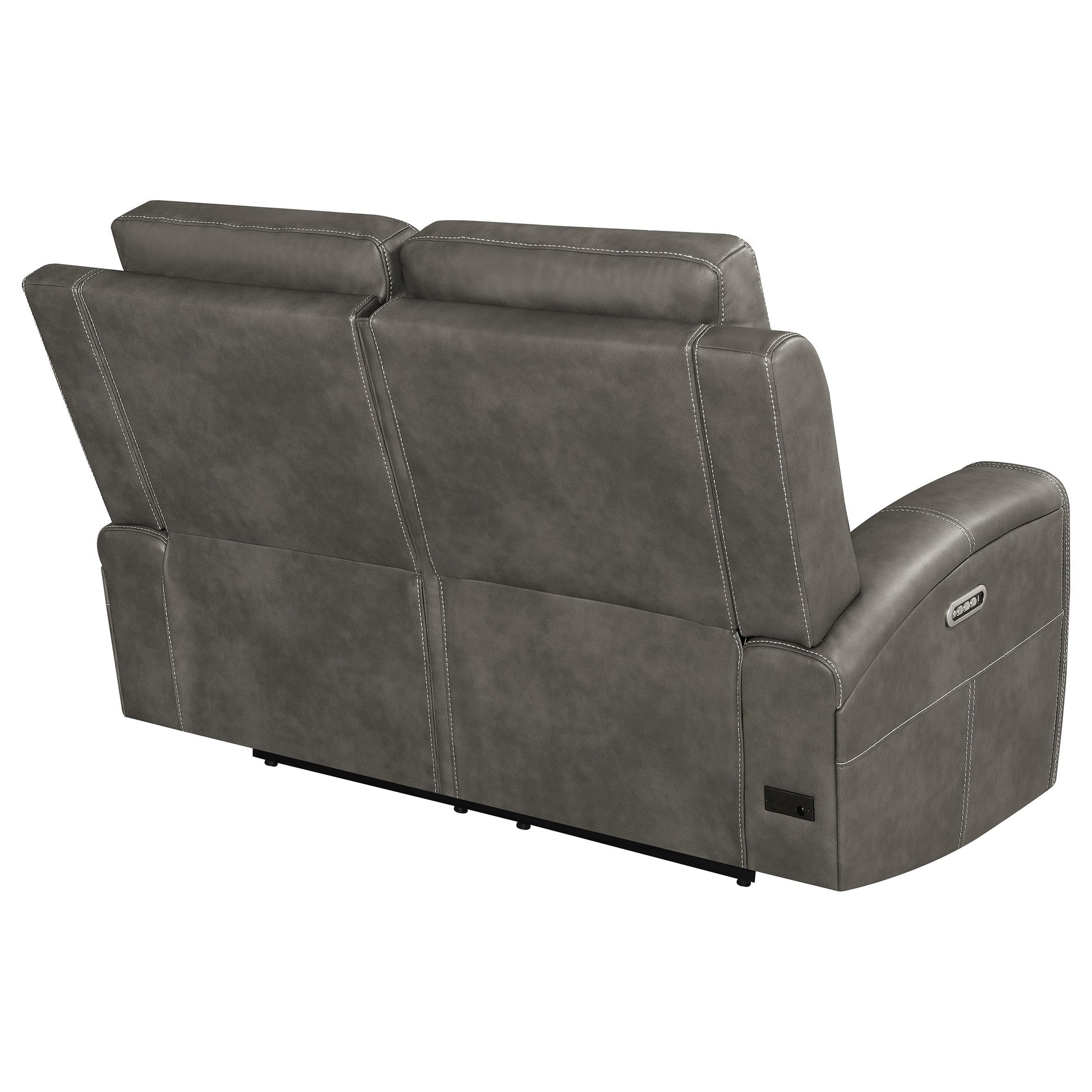 Designed to embrace your every mood, this triple power reclining loveseat transforms quiet evenings into indulgent escapes. Rich leatherette envelopes sculpted cushions, tailored with striking contrast stitching for a refined, modern aesthetic. Effortlessly adjust the power recline, headrest, and lumbar support with an integrated control panel, complete with dual USB ports to keep your devices powered and close. Thoughtfully placed armrest cup holders elevate your lounging experience, while a rear AC access port with emergency battery option ensures seamless operation, no matter the moment.