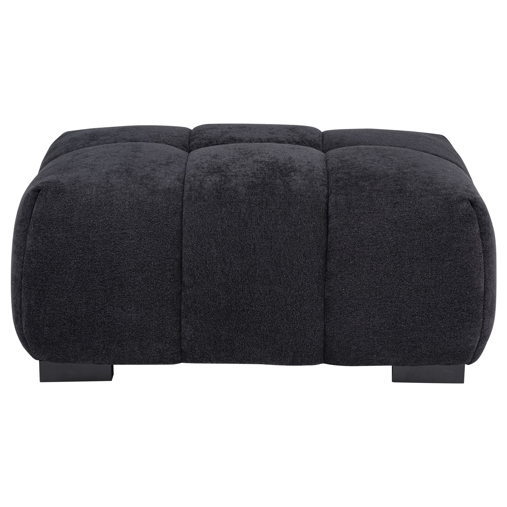 Lush and sculpted, this rectangular ottoman is a visual and tactile delight. Wrapped in soft black fabric, its deep channel tufting flows over a pillowy surface, inviting feet to rest or trays to perch. Designed to complement its matching pieces or stand boldly on its own, it offers softness, presence, and undeniable style. Built from durable materials, it brings both comfort and modern drama to any space.