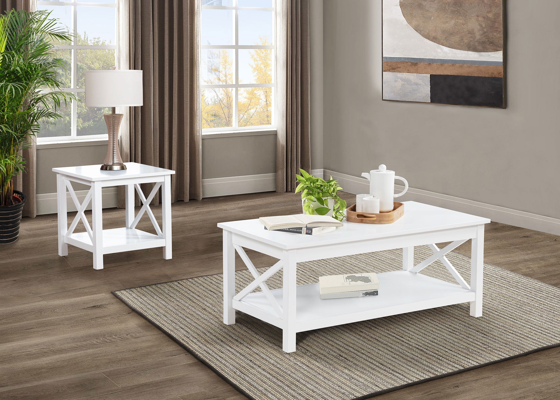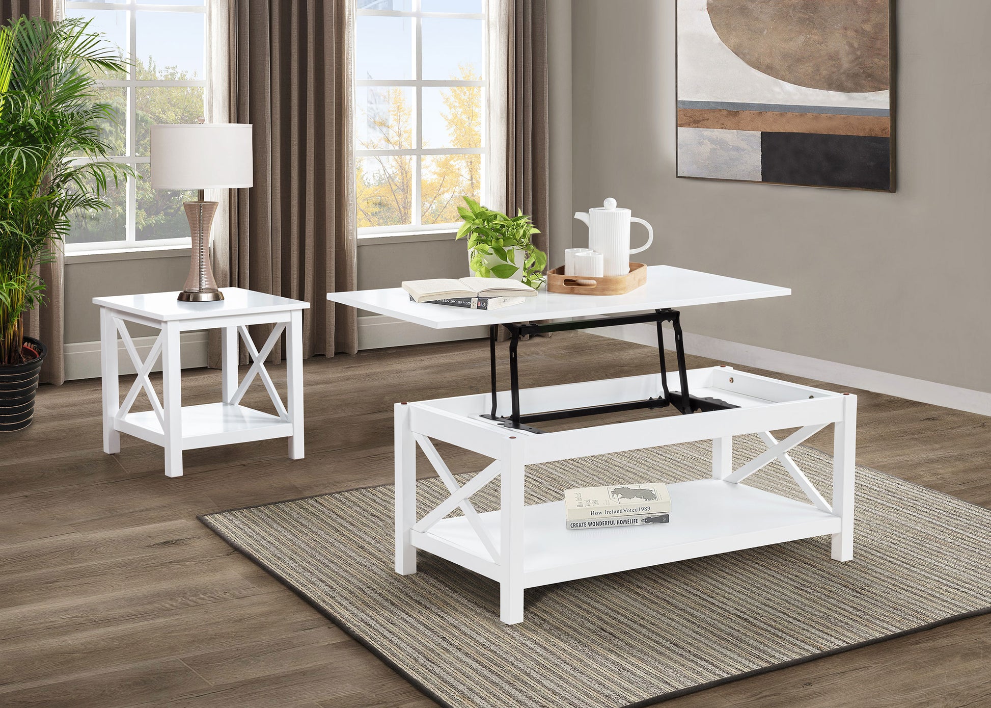 Blending clean lines with classic charm, this occasional table set offers timeless appeal with practical purpose. The lift-top coffee table features hidden storage and a rising surface for flexible use, while the matching end table provides open shelving and farmhouse-inspired X-frame sides. Finished in bright white and crafted from pine and engineered wood, this living room set brings fresh energy and functional design to everyday moments.