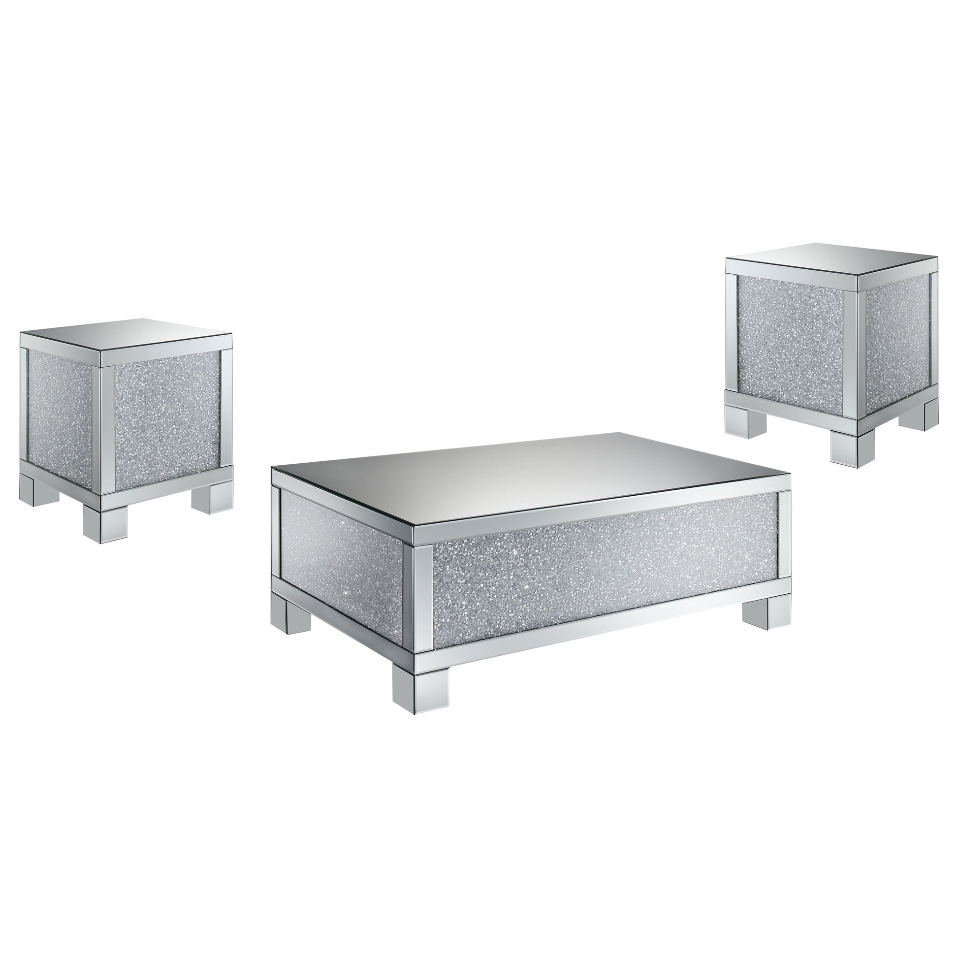 This glam mirrored coffee table set with a 48-inch rectangular coffee table and 20-inch square end table, combining style with practicality. Pieces feature engineered wood frames, fully mirrored surfaces, and dazzling acrylic crystal accents. The sleek designs and reflective finishes add light, dimension, and a luxurious glam vibe to contemporary interiors.