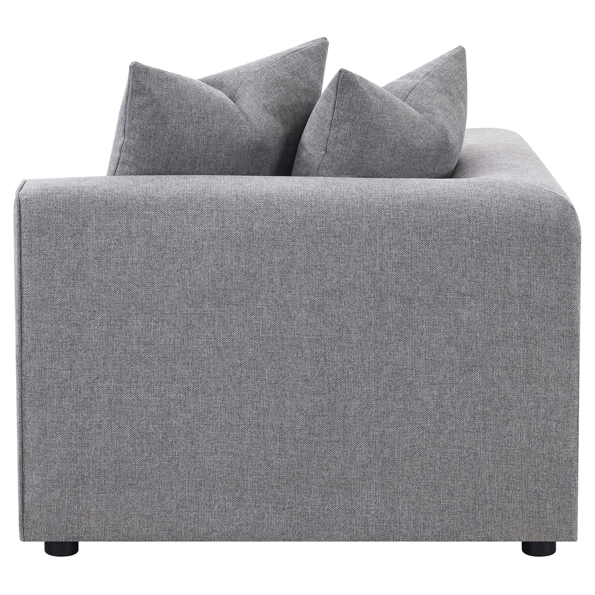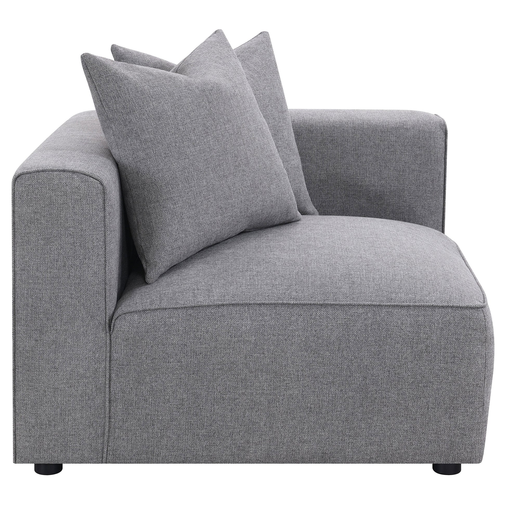 Transform your modular sectional into a L-shaped configuration with this clean and contemporary modular corner chair. With a low-profile design of a track style backrest that doubles as arms, this modular corner chair caps one end of a long sectional sofa and bridges together two main pieces. The tailored tight seat is accented with welt trim along the upper edge. Lending a neutral color palette to enhance with decorative pillows or leave to its sophisticated tone, a soft grey woven fabric brings it all together. Matching pillows offers a plush backing to soften the hard line track back design.