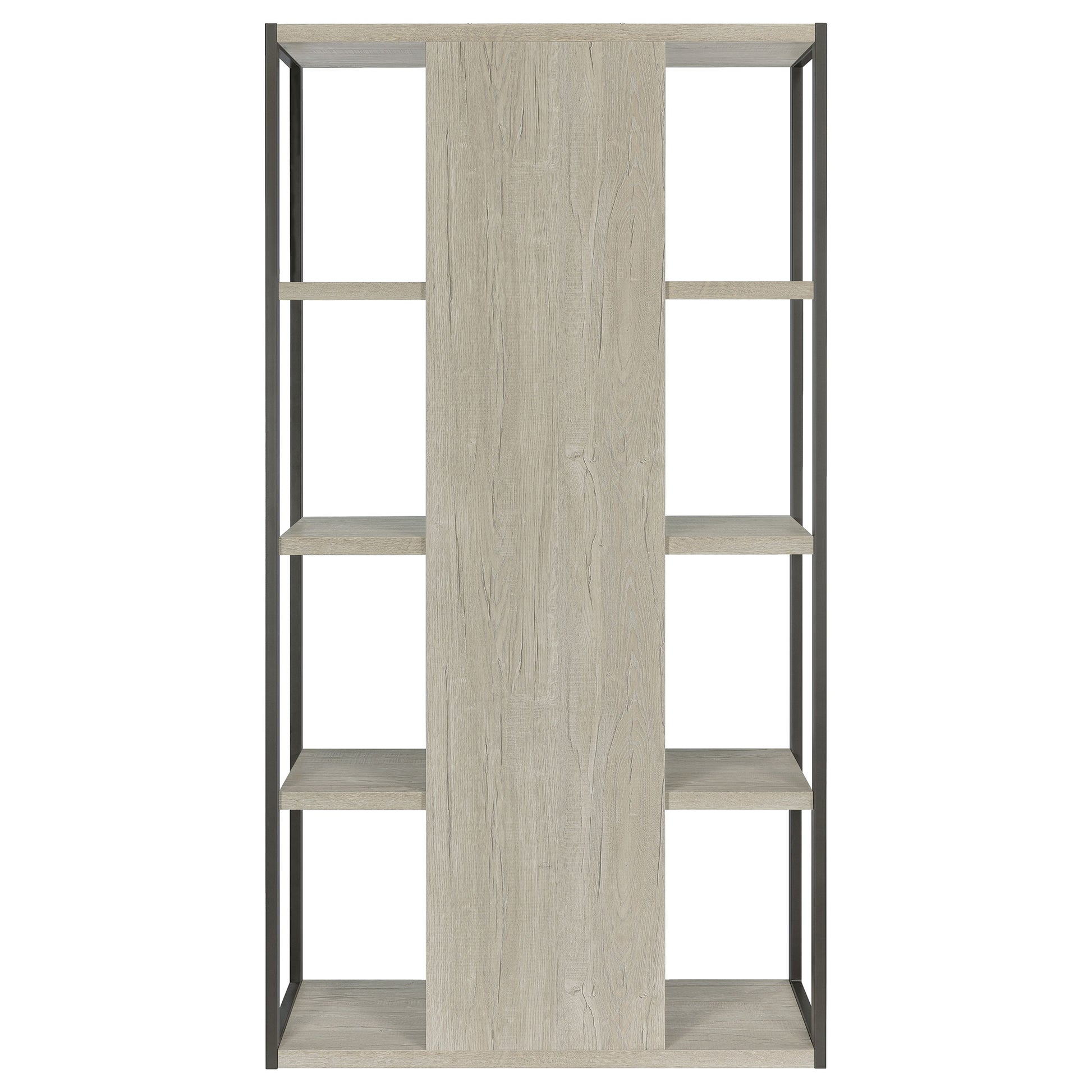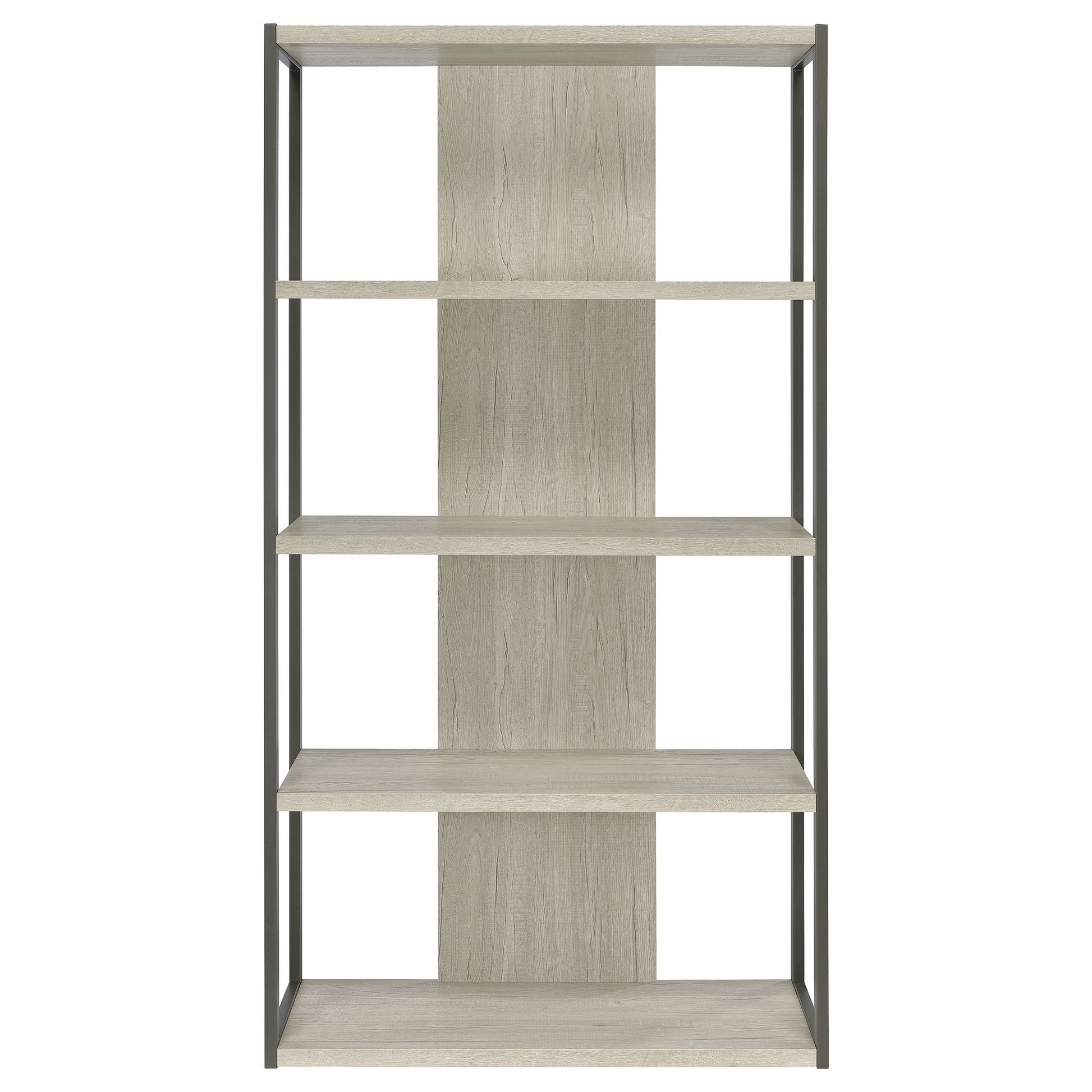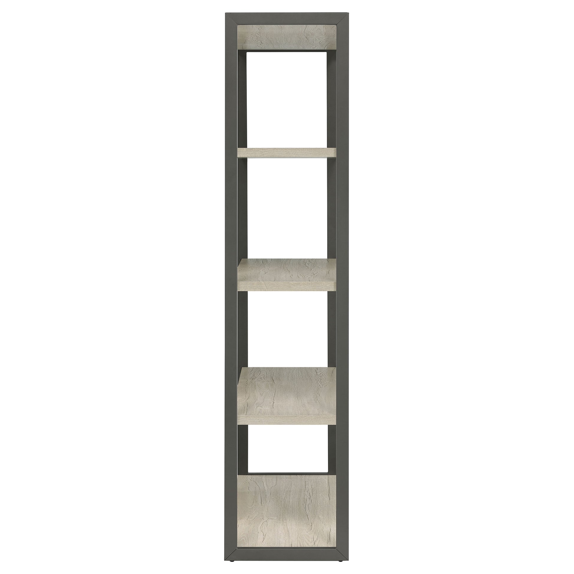 Showcase your favorite books and decor on this open and airy, tall contemporary bookcase, designed with four slim whitewashed grey shelves suspended by a bold grey finished frame. The back support and flush bottom shelf offers stability against area rugs and flooring.