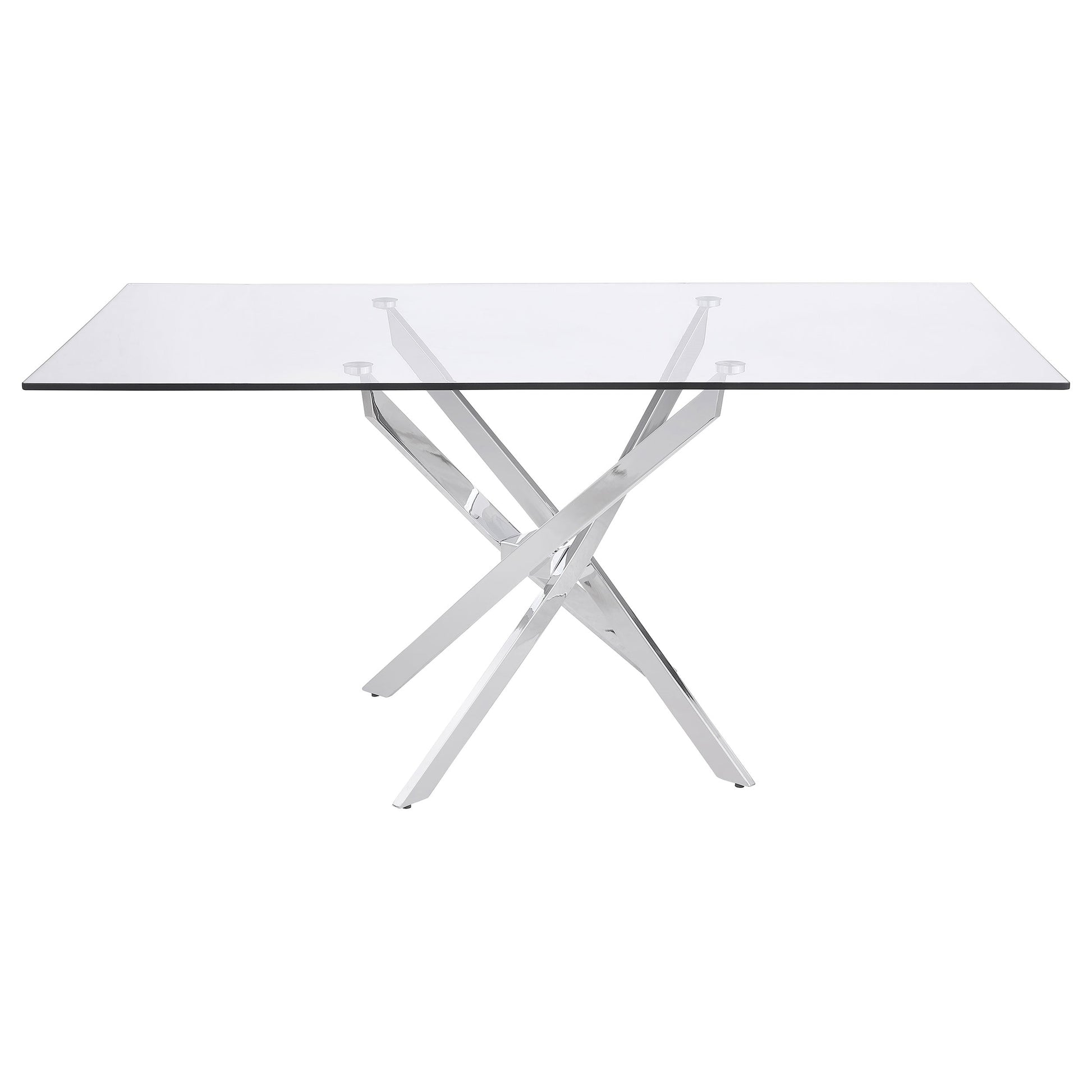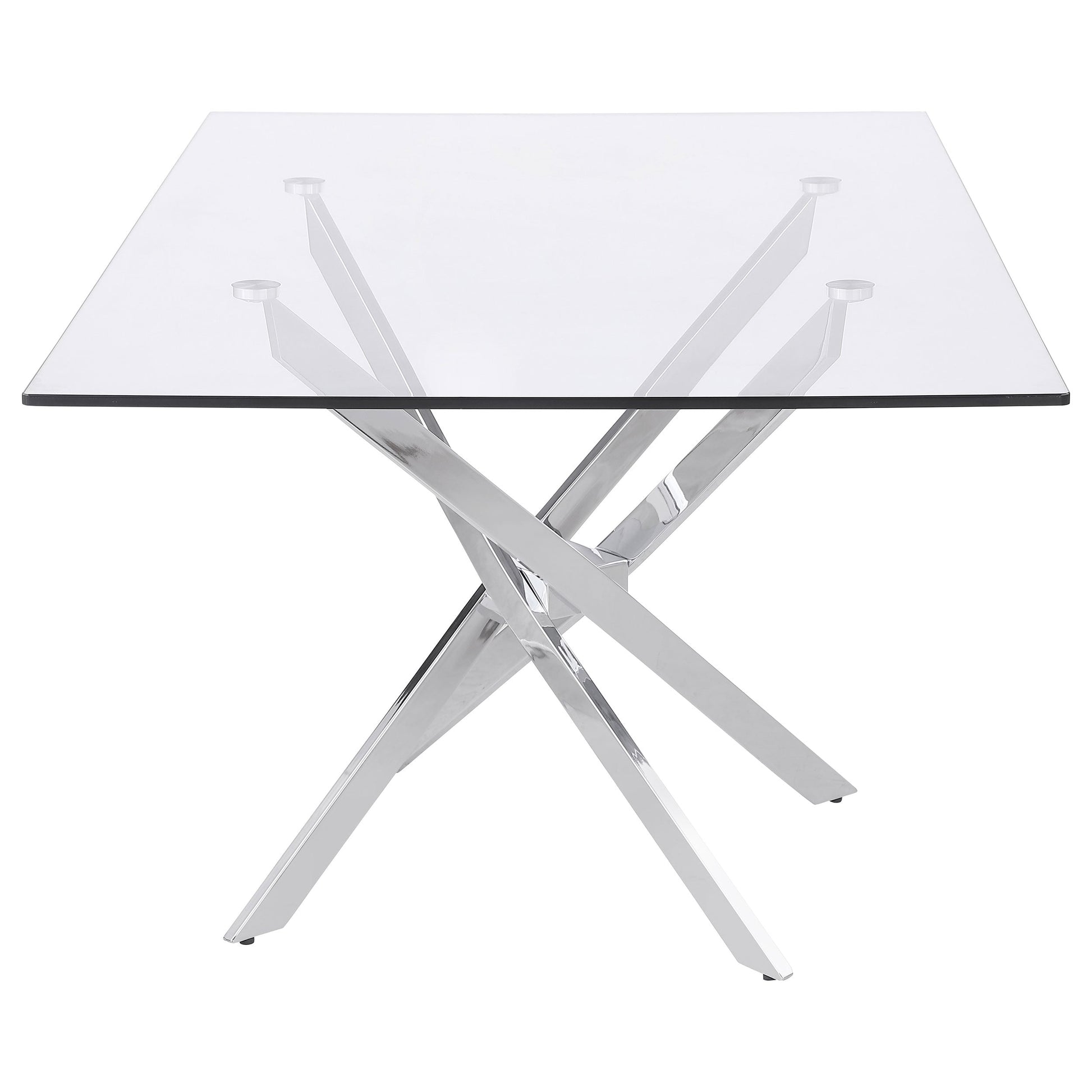Esta mesa de comedor rectangular ofrece un impacto escultural con un perfil moderno y definido. Su tablero de vidrio templado transparente ofrece una superficie limpia y duradera que amplía visualmente el espacio. Debajo, una llamativa base en forma de asterisco, elaborada en metal de gran espesor, le aporta un toque arquitectónico, con un acabado en cromo galvanizado que le da un efecto pulido y reflectante. Una audaz combinación de minimalismo y diseño vanguardista, esta mesa es la pieza central de cualquier comedor contemporáneo.