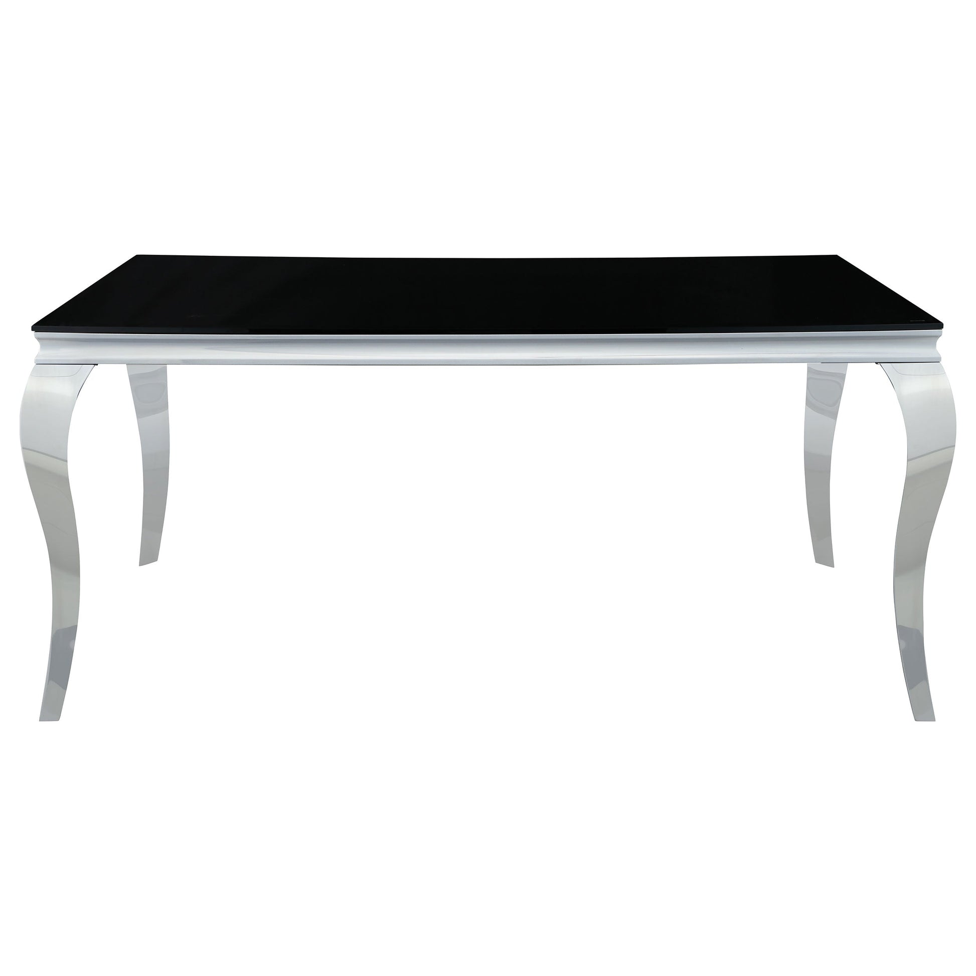 La base de la mesa con acabado en cromo pulido presenta patas Cabriole dramáticamente curvadas rematadas con una cubierta de vidrio templado negro.