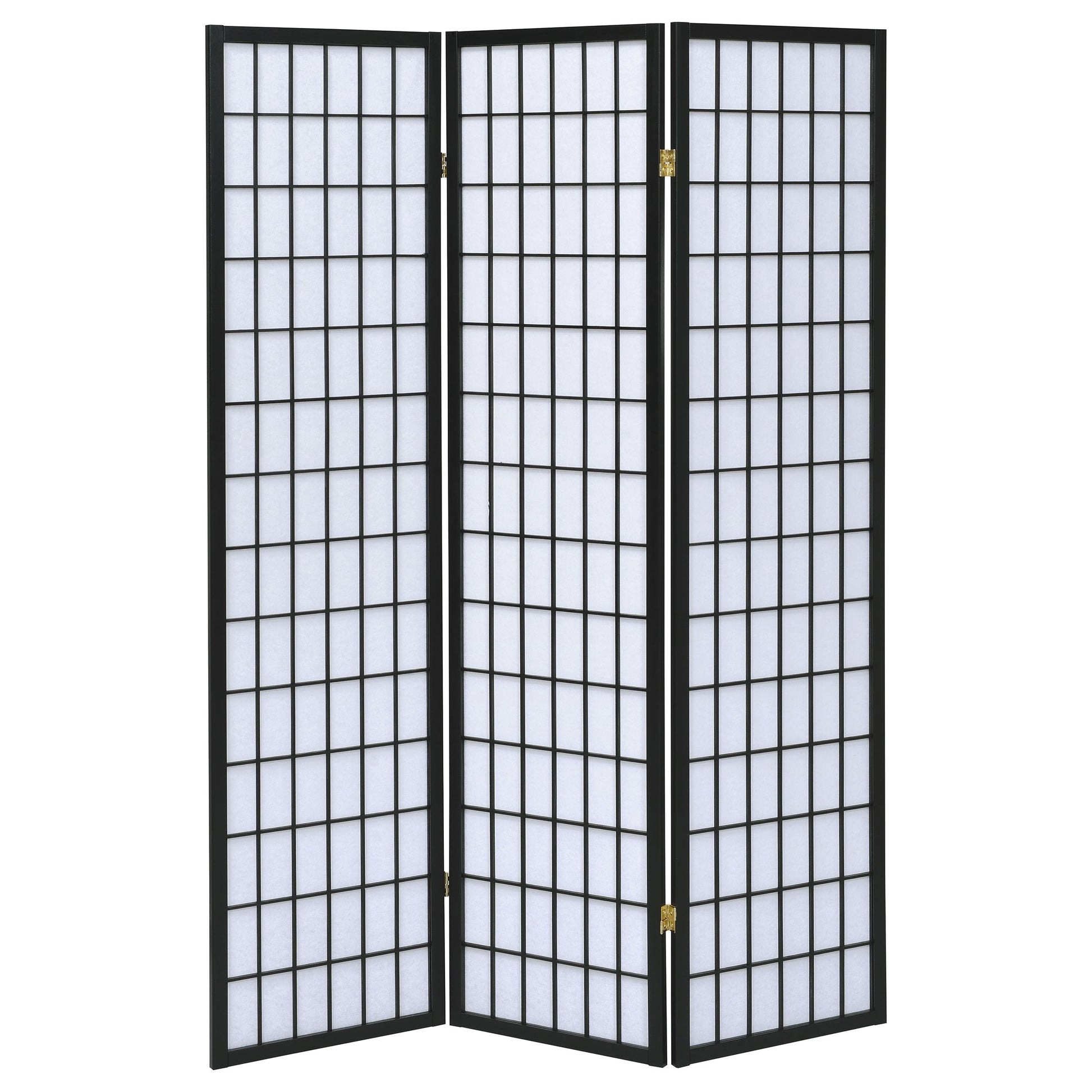 Este biombo de tres paneles tiene diversas funciones en tu sala de juegos o sala familiar. Úsalo como separador para separar una conversación privada de la reunión grupal para ver el partido. Es un elemento de fondo simple y estético colocando una mesita auxiliar y sillas frente a él. Incluso puedes colocarlo detrás de un sofá o sillón blanco o negro. El marco negro y la tela blanca en contraste con estampado de bloques complementan una habitación con decoración oscura.