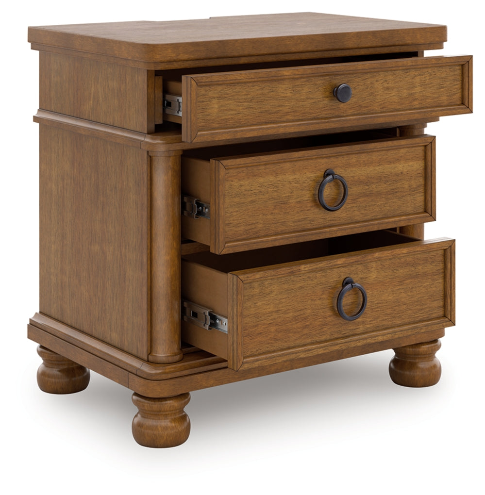 Taking a laid-back approach to casual traditional design, this artfully crafted nightstand combines classic elements with a clean modern approach. Its rich medium brown wood tone exudes a comfy, timeless appeal that's sure to carry you away to a dreamy time and place. Simple round metal knobs and ring pulls on the nightstand's spacious drawers make just the right statement, while an integrated power outlet and USB charging keep your devices powered up overnight.