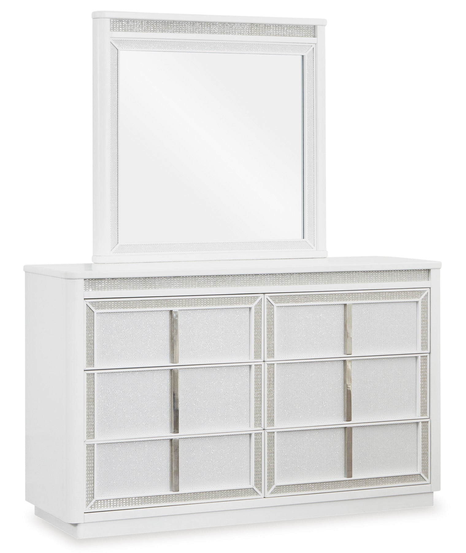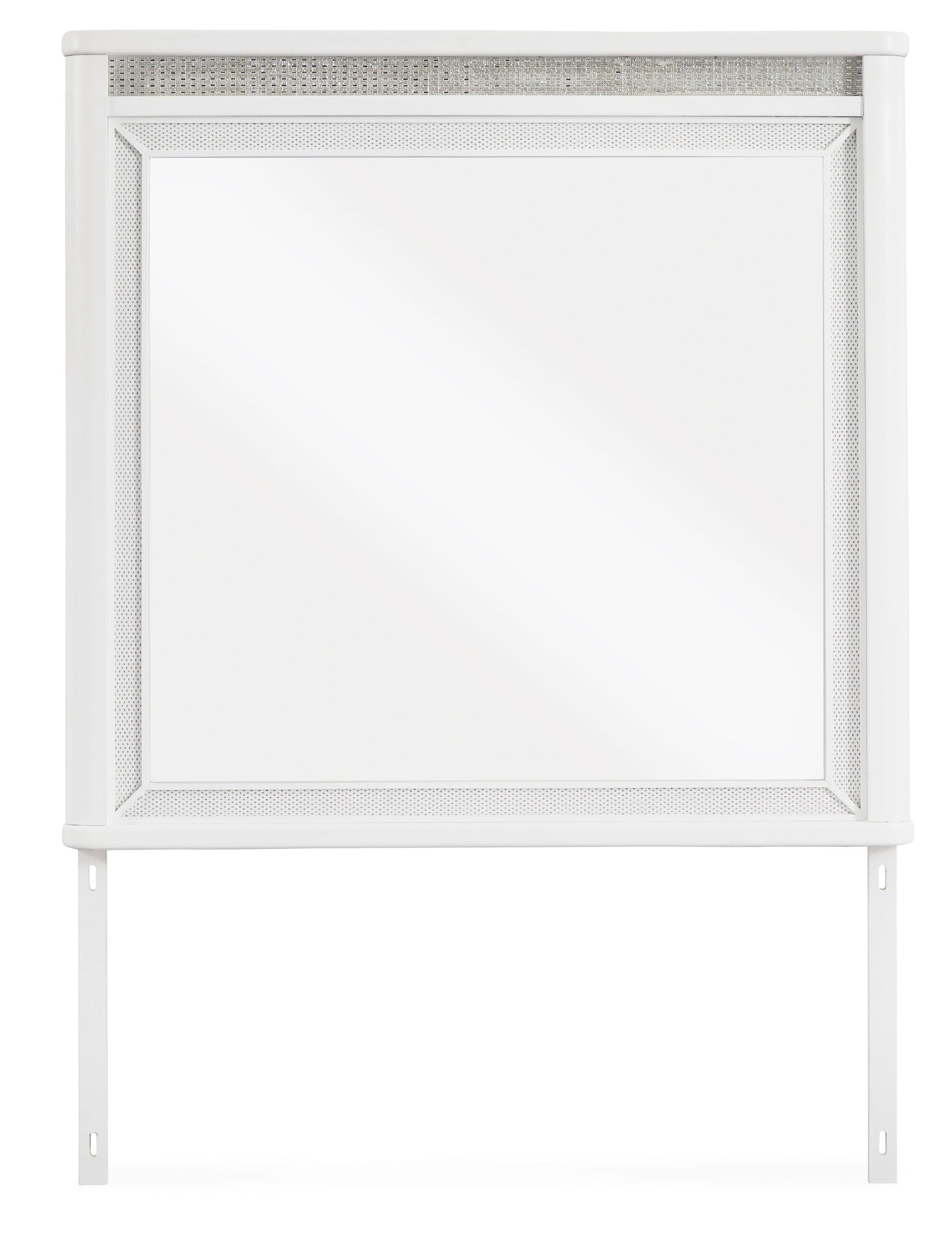 Este espejo de dormitorio está fabricado con componentes de madera maciza, sustrato de MDF y laminado decorativo. Combina con otros artículos de la serie para crear un conjunto de tocador y espejo.