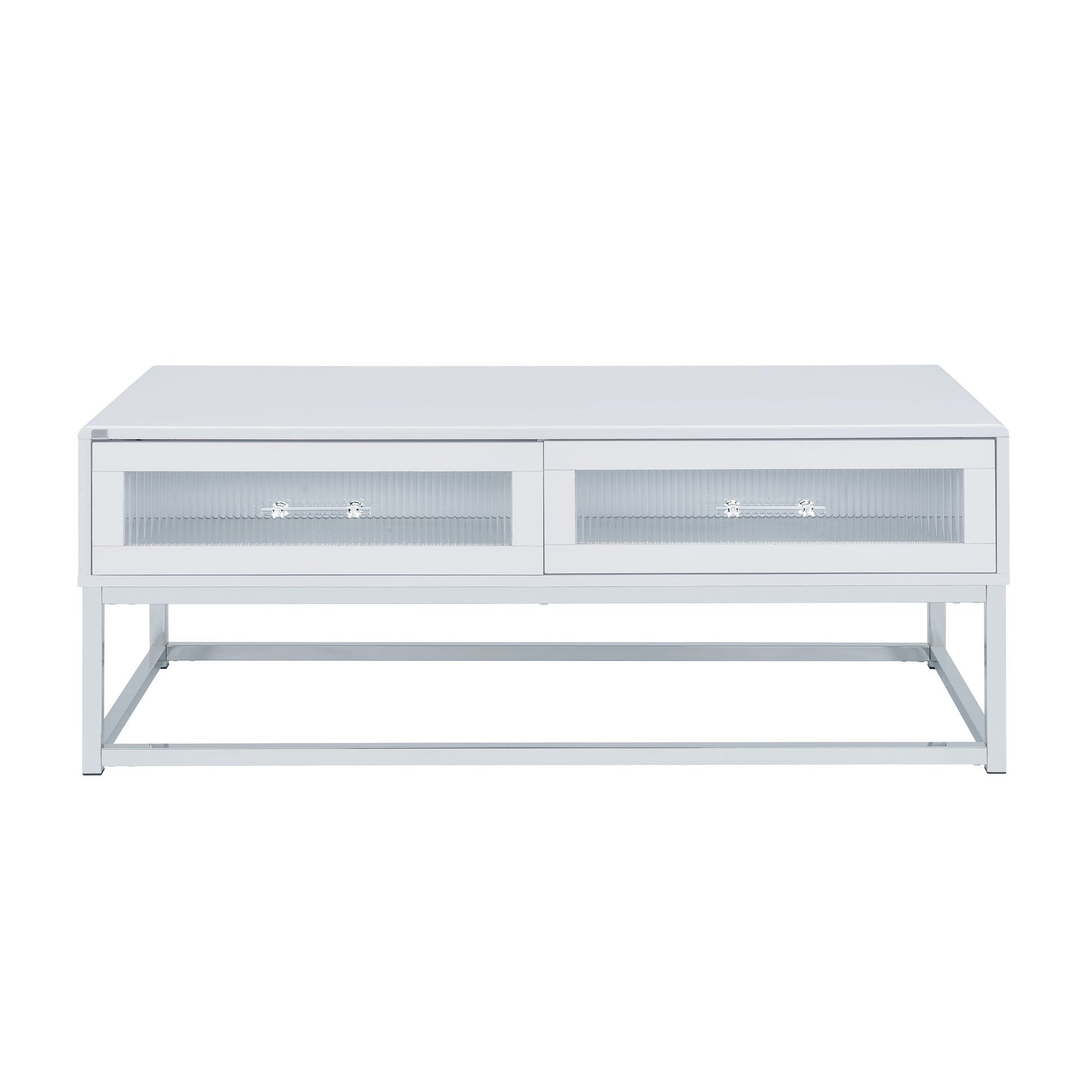 Add a touch of modern elegance to your living room with the Chandra Coffee Table. This stunning table features a glossy white finish and a sleek chrome-finished metal base, creating a contemporary look that will elevate any space. The LED lights add a pop of color and ambiance, while the spacious drawers provide ample storage for your essentials. The acrylic handles add a touch of sophistication and style to the overall design. Bring stylish functionality to your home with the Chandra Coffee Table.