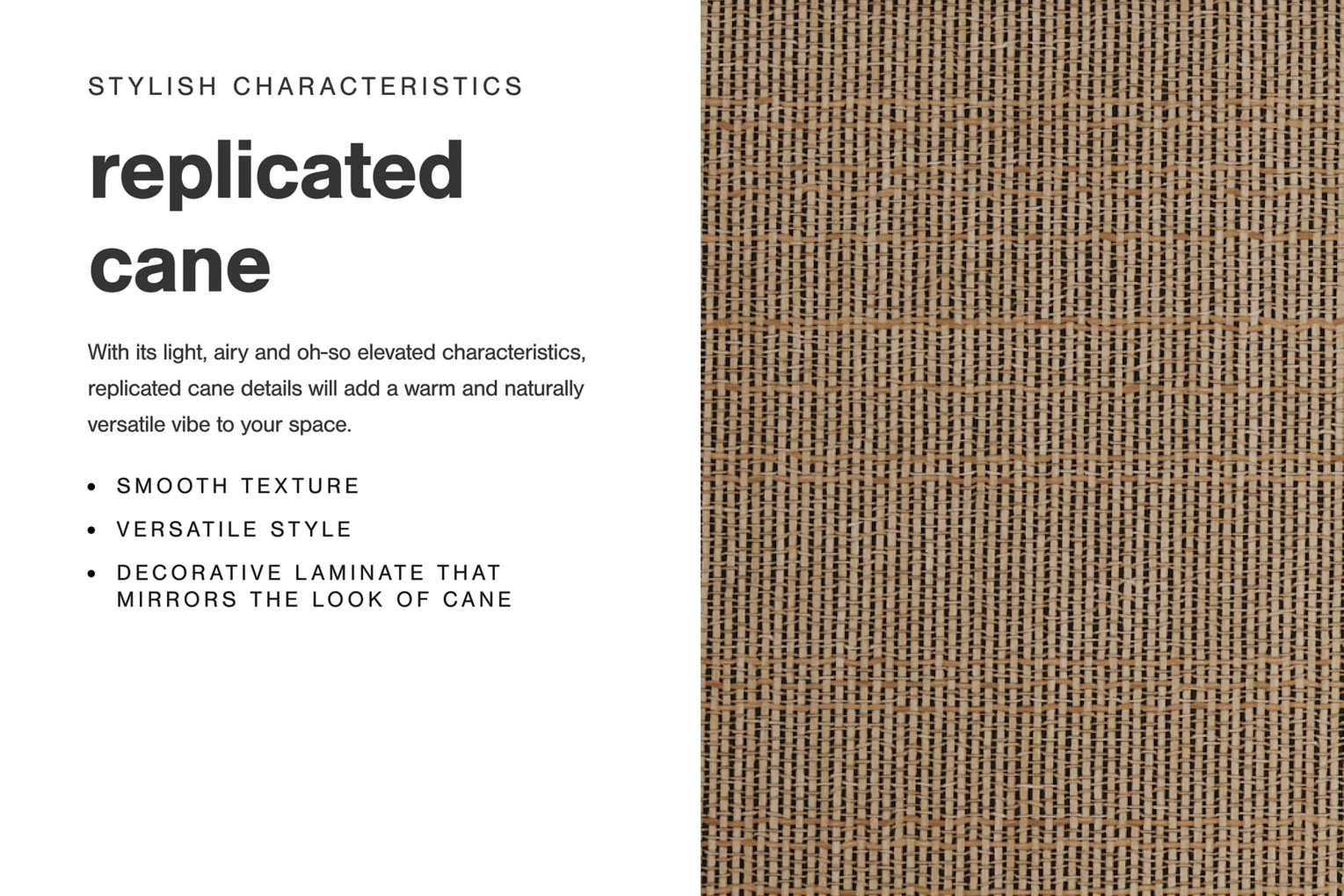 - Headboard panel with textured beige finish that replicates the look of cane