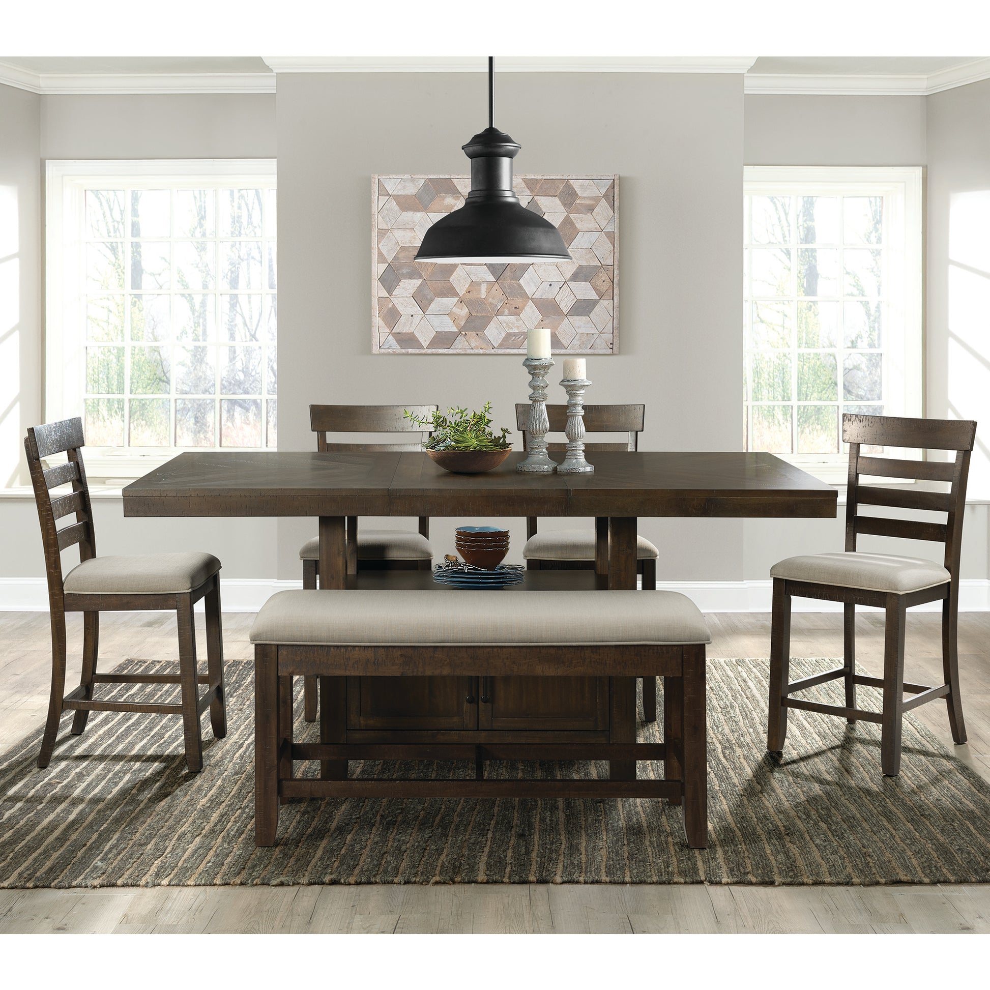 The Colorado dining collection, brings boldness to a casual dining scheme. With a trestle base design and a deep finish, this everyday counter height table serves as a perfect gathering space. Enjoy an attractive chevron design on its table top while accommodating deep chairs and extra storage. The inventive table design creates options for positioning to suite your needs. The slat back design of the chair and the black hardware finishes, reflect a design-forward blend of modern and farmhouse concept.