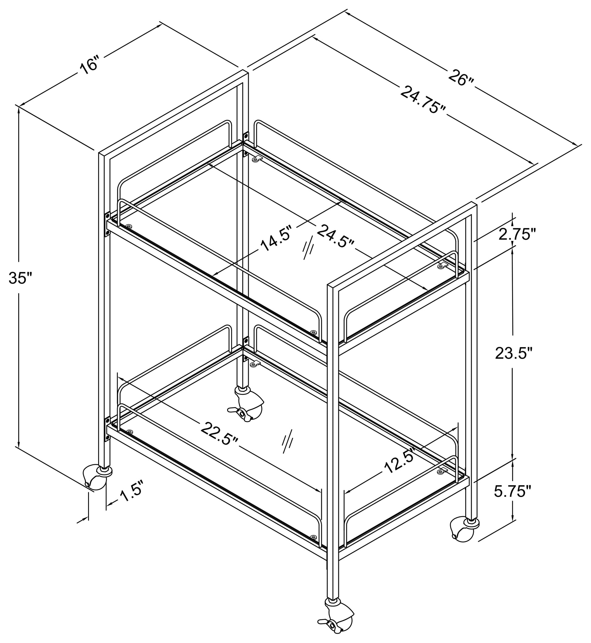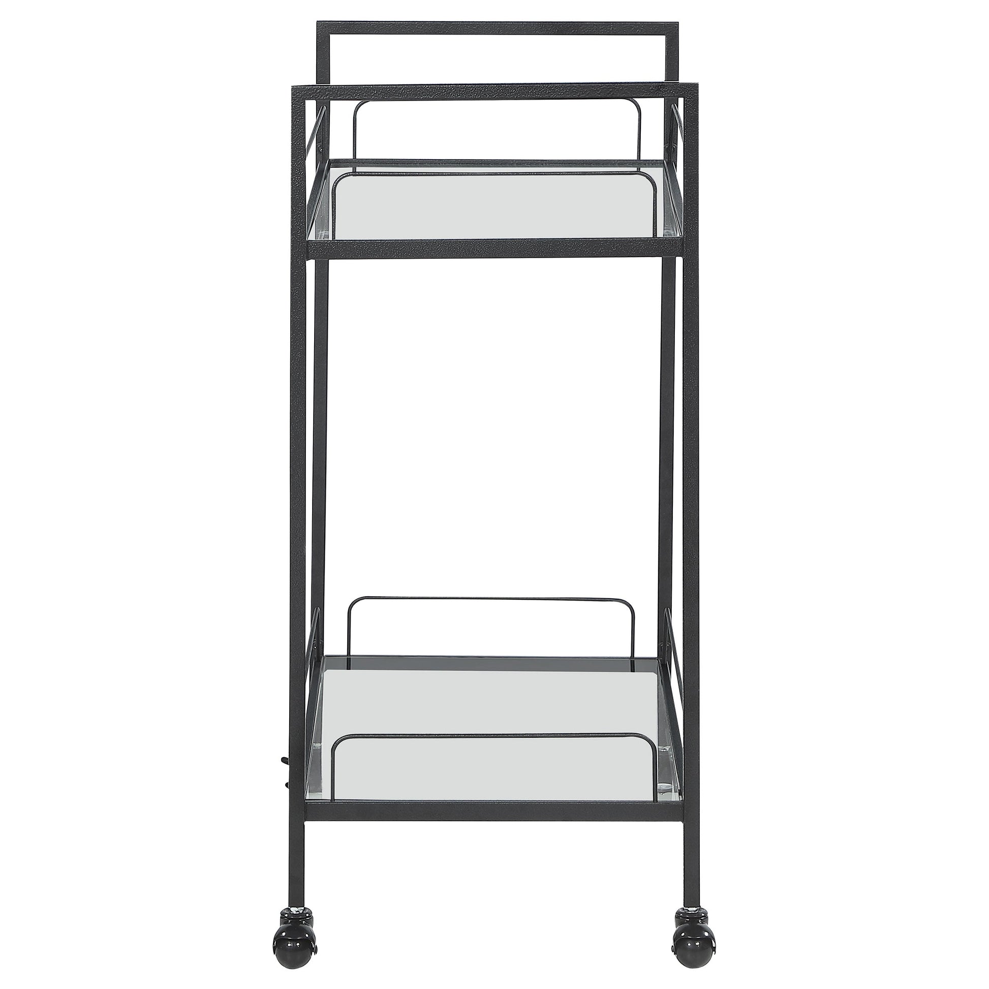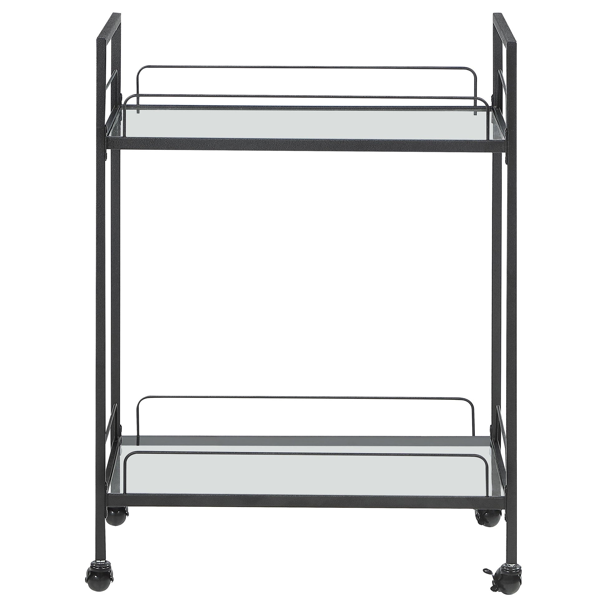 Las líneas minimalistas y limpias crean una estética versátil y elegante en este moderno carrito de servicio. Fabricado con una delgada estructura metálica con acabado en polvo negro martillado y ruedas, este carrito permite transportar fácilmente cristalería, accesorios y aperitivos a una zona de entretenimiento para invitados y visitas. Los estantes apilados de vidrio templado transparente muestran las copas y las cosechas favoritas de los invitados para su selección personal. Gracias a sus bordes elevados, puede estar tranquilo sabiendo que todo se mantiene en su lugar de forma segura. Llévelo a su sala de estar para pequeñas reuniones o guárdelo en un apartamento pequeño como un carrito de bar multifuncional.