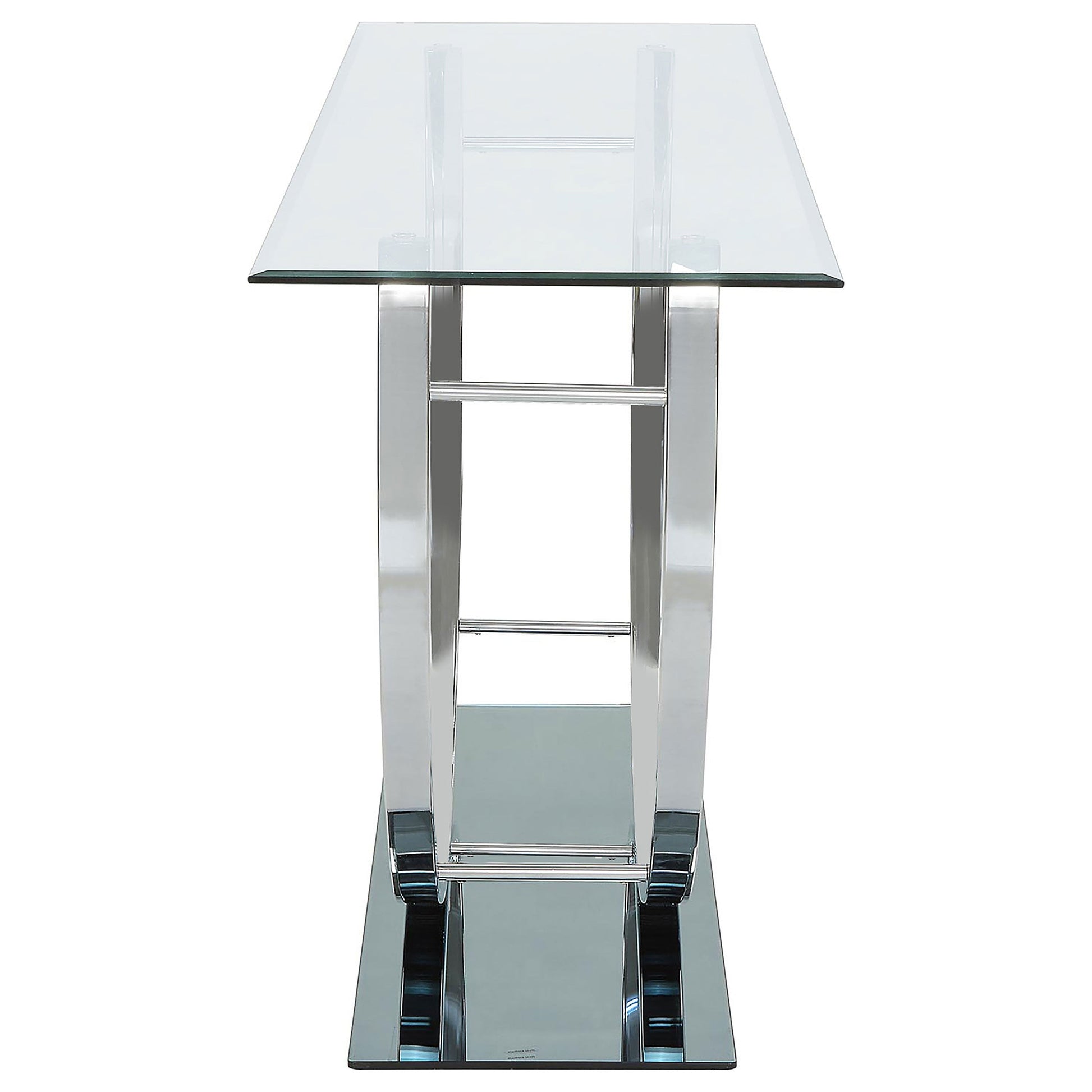 Esta moderna consola rectangular luce un tablero de vidrio templado transparente y una elegante base de espejo, creando un estilo refinado y contemporáneo. Su estructura curva, fabricada en metal cromado galvanizado de gran espesor, añade un toque de sofisticación y elegancia. Fabricada con materiales duraderos, esta consola es perfecta para entradas, pasillos o detrás de sofás, ofreciendo una pieza impactante y funcional que realza cualquier espacio moderno, garantizando una calidad duradera.