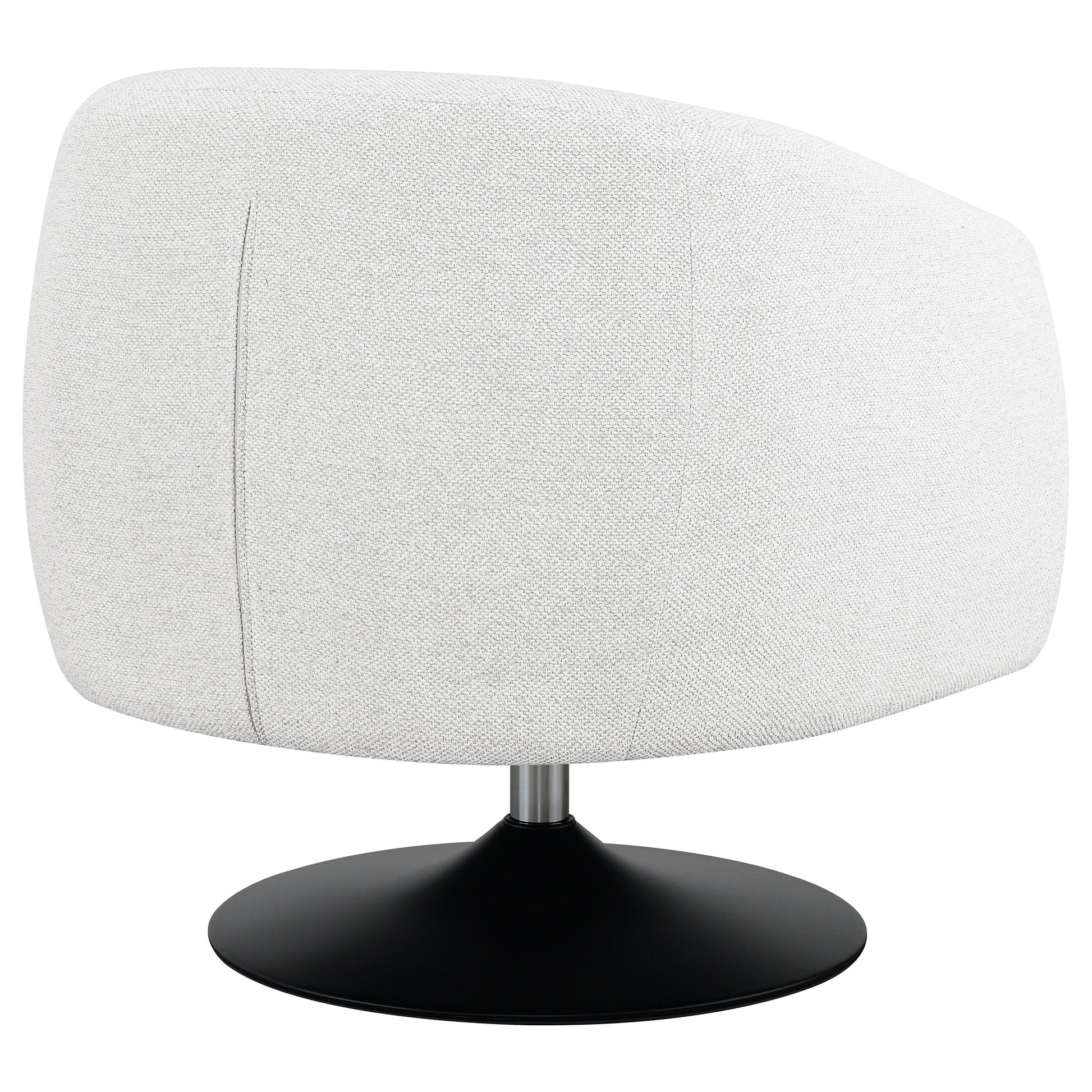 Envuelta en tela bouclé beige, esta contemporánea silla giratoria decorativa es el complemento perfecto para un hogar de inspiración vintage. Con un toque retro, esta silla ofrece un diseño de barril sobre una base de pedestal que gira 360 grados. Maravillosa adición a un espacio de conversación o de entretenimiento de planta abierta, esta elegante silla giratoria también ofrece un respaldo suavemente redondeado con un sutil capitoné y reposabrazos cónicos. Un cojín de asiento a medida, estilo cascada, realza las líneas limpias de esta ingeniosa y versátil silla decorativa. El acabado negro mate de la base también añade un llamativo contraste para un toque moderno.