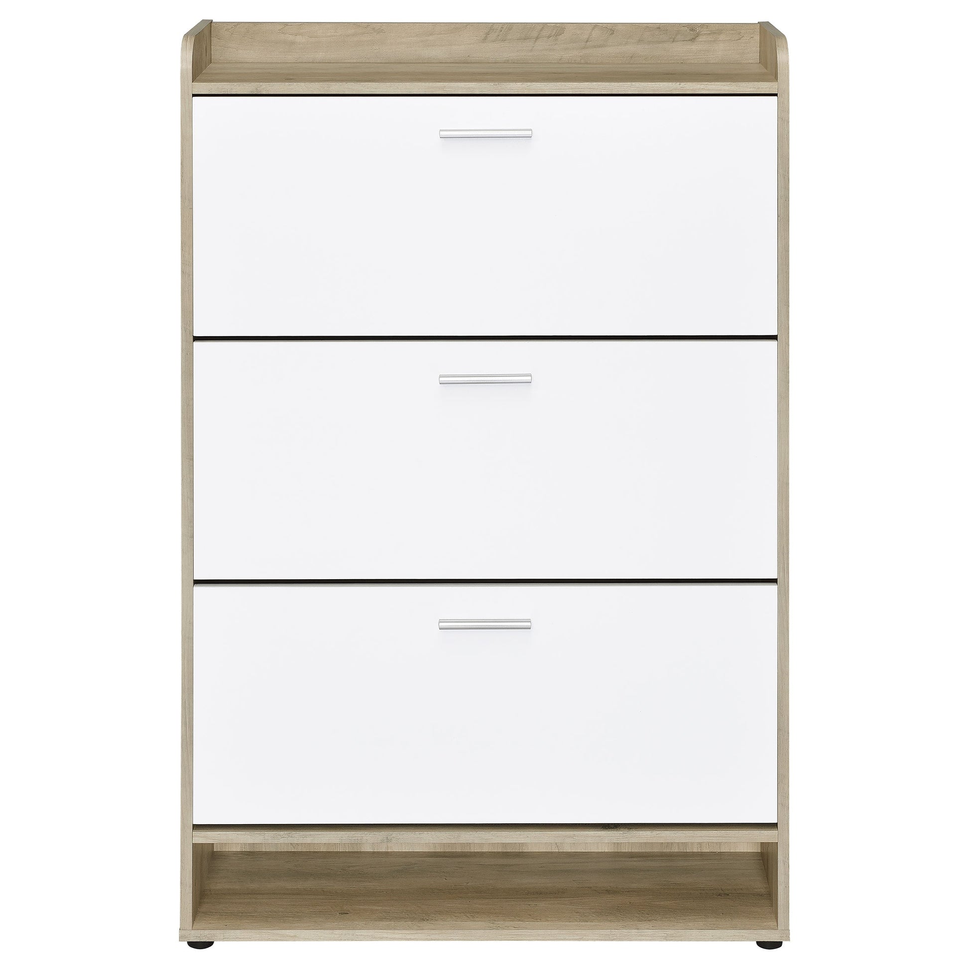 Mejore la organización de su entrada con nuestro zapatero bicolor, una armoniosa combinación de practicidad y diseño contemporáneo. Este elegante mueble, fabricado con robusta madera de ingeniería y un laminado con aspecto de madera, ofrece tres niveles de estanterías para su calzado, cada uno de los cuales garantiza un espacio ordenado. La elegante parte superior es el lugar perfecto para colocar sus toques decorativos o artículos esenciales de uso diario, mientras que un compartimento adicional en la base se encarga discretamente de las necesidades de almacenamiento adicionales. Este mueble se adapta a la perfección a la estética de su hogar, garantizando que estilo y funcionalidad vayan de la mano.