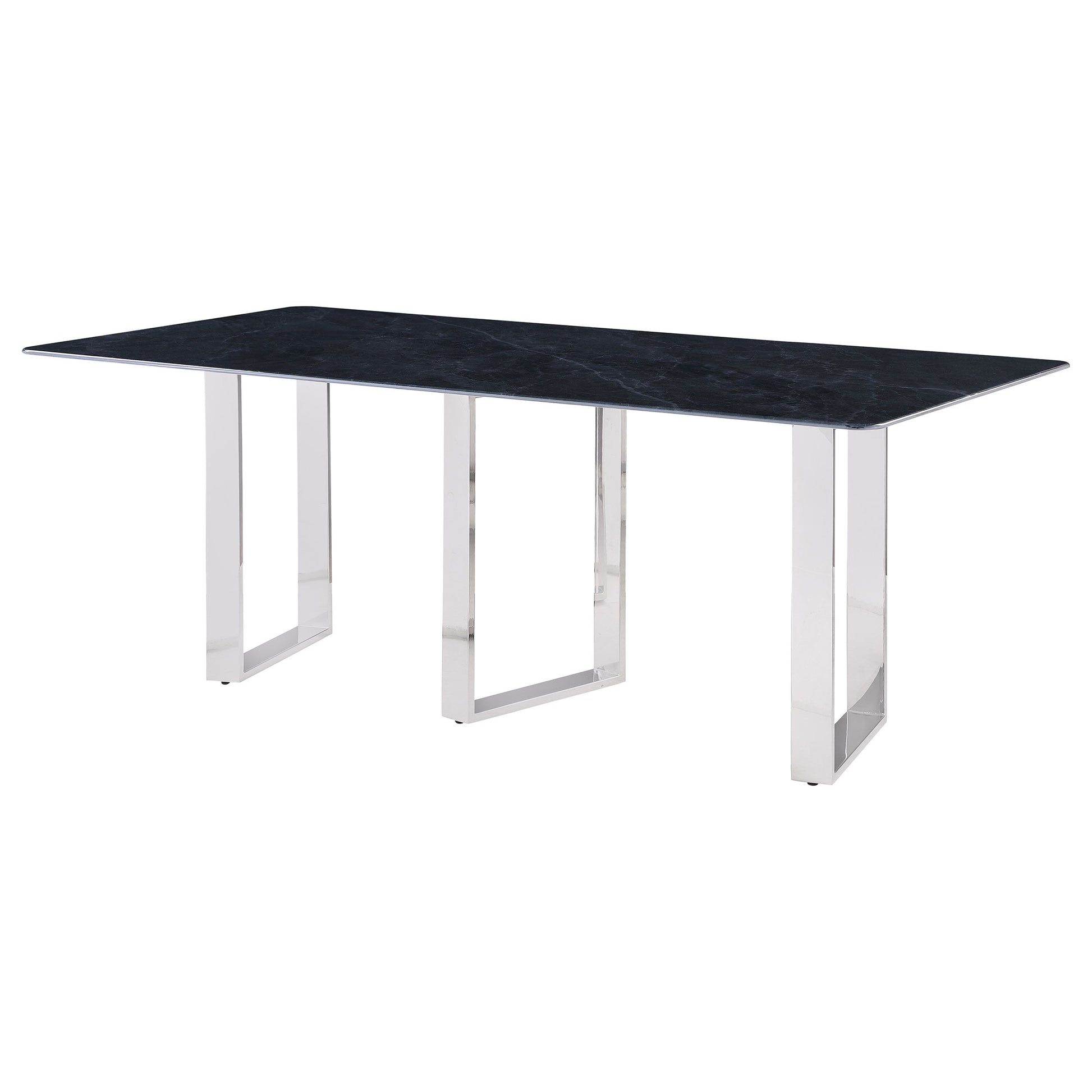 Inyecte un toque de sofisticación con una moderna mesa de comedor rectangular. Con un tablero de piedra sinterizada con acabado de mármol gris y una silueta estilizada, la mesa se convierte en la pieza central de su comedor. Se apoya sobre tres patas de estructura abierta que le aportan un estilo estilizado y ligero. La presentación angular de sus patas aporta una dimensionalidad visual intrigante a cualquier comedor. Su acabado plateado pulido es atemporal y refinado, perfecto para su espacio.