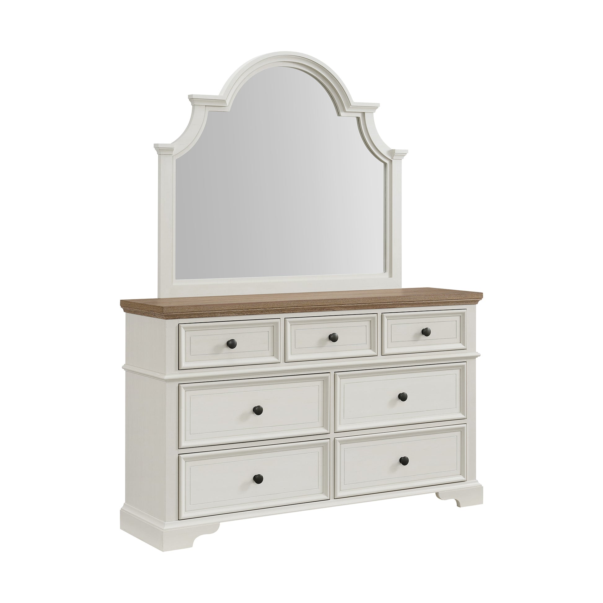 Create an inviting sanctuary with the beautifully crafted Eastwood collection, a bedroom set exuding timeless charm and elegance. The two-tone design with rich brown tops adds depth and sophistication, complementing the graceful curves and notched corners of the arched headboard. Luxurious diamond button tufting enhances the soft upholstered headboard, while the subtly bowed footboard completes the elegant silhouette. A traditional arched beveled mirror reflects the classic beauty of the set. Experience practicality with felt-lined top drawers for delicate items, smooth ball-bearing drawer guides, and durable French dovetail construction. With added safety from anti-tipping kits, the Eastwood Bedroom Set blends intricate detail, functionality, and durability for an enchanting bedroom experience.