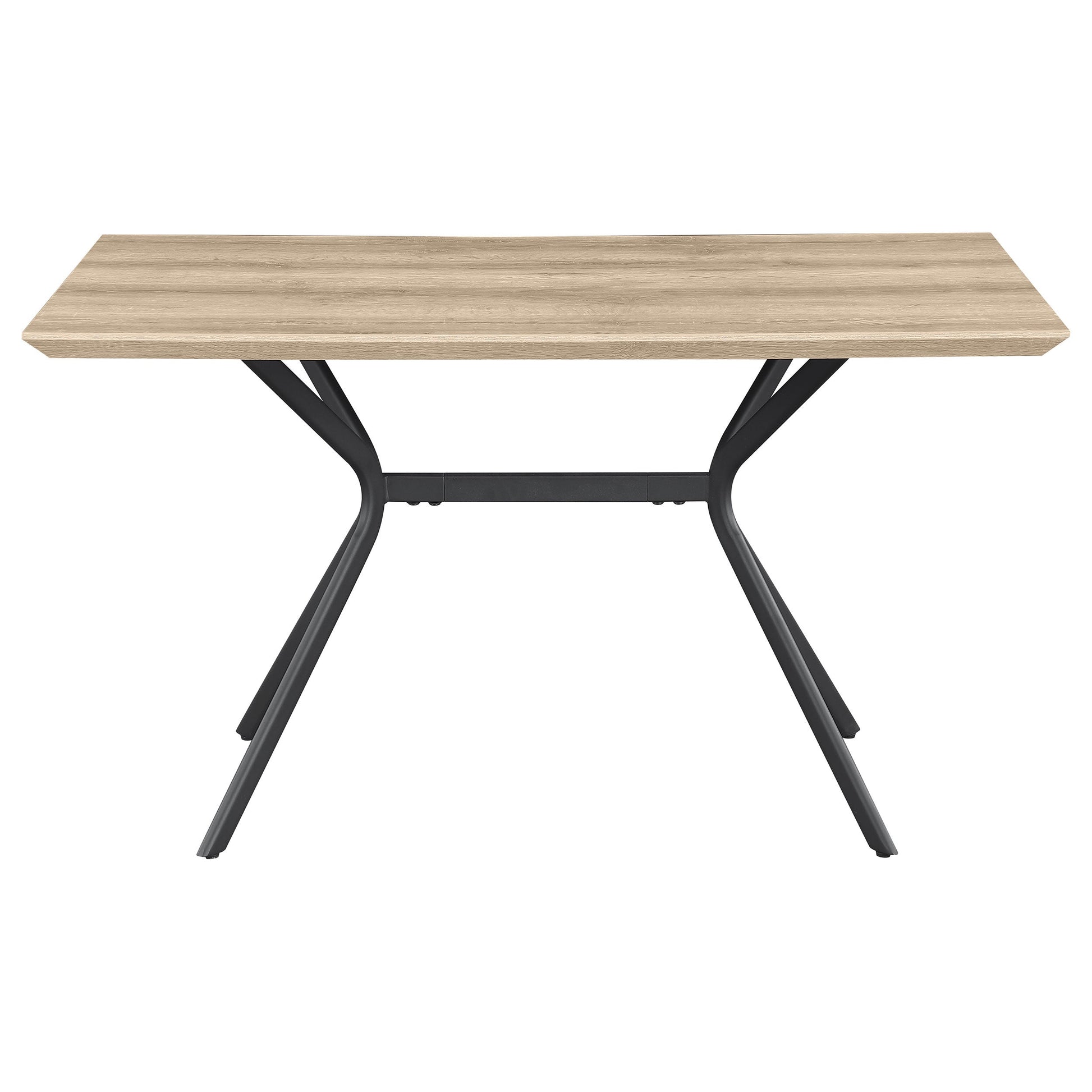 Renueva tu cocina o comedor con una mesa de comedor moderna e informal. Su silueta rectangular es versátil y elegante, perfecta para espacios multifuncionales como desayunadores y comedores compactos. Su tablero con acabado de veta de madera marrón medio, fabricado con melamina, ofrece una excelente durabilidad y resistencia a abolladuras y rayones. Su borde en ángulo le aporta un toque refinado, ideal para un espacio acogedor y contemporáneo. La base de la mesa cuenta con cuatro patas angulares en forma de V con soporte transversal, todo en acabado negro sobre una estructura metálica que proporciona estabilidad.