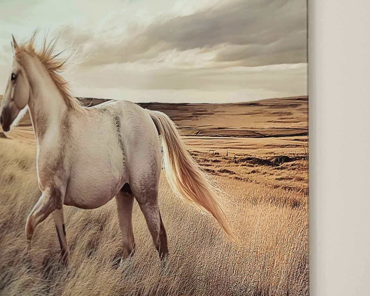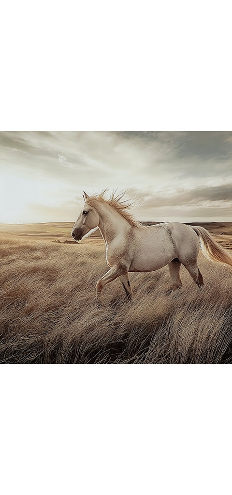 This wall art brings serene beauty to your home. This captivating print on glass captures the grace and majesty of a wild horse galloping through a golden field. The warm, earthy tones and dynamic composition create a sense of freedom and movement. It's a perfect choice to enhance your wall decor with nature-inspired artistry.